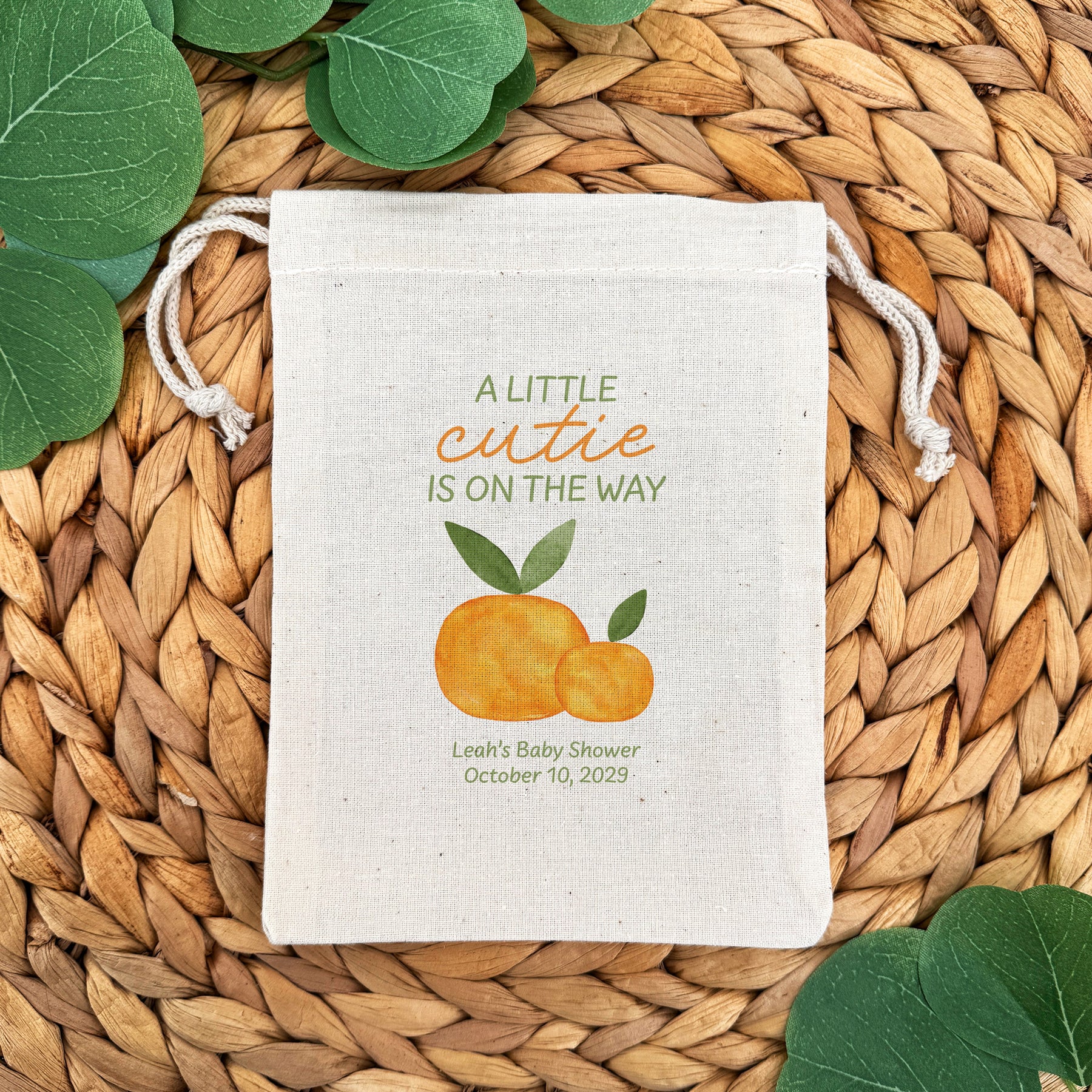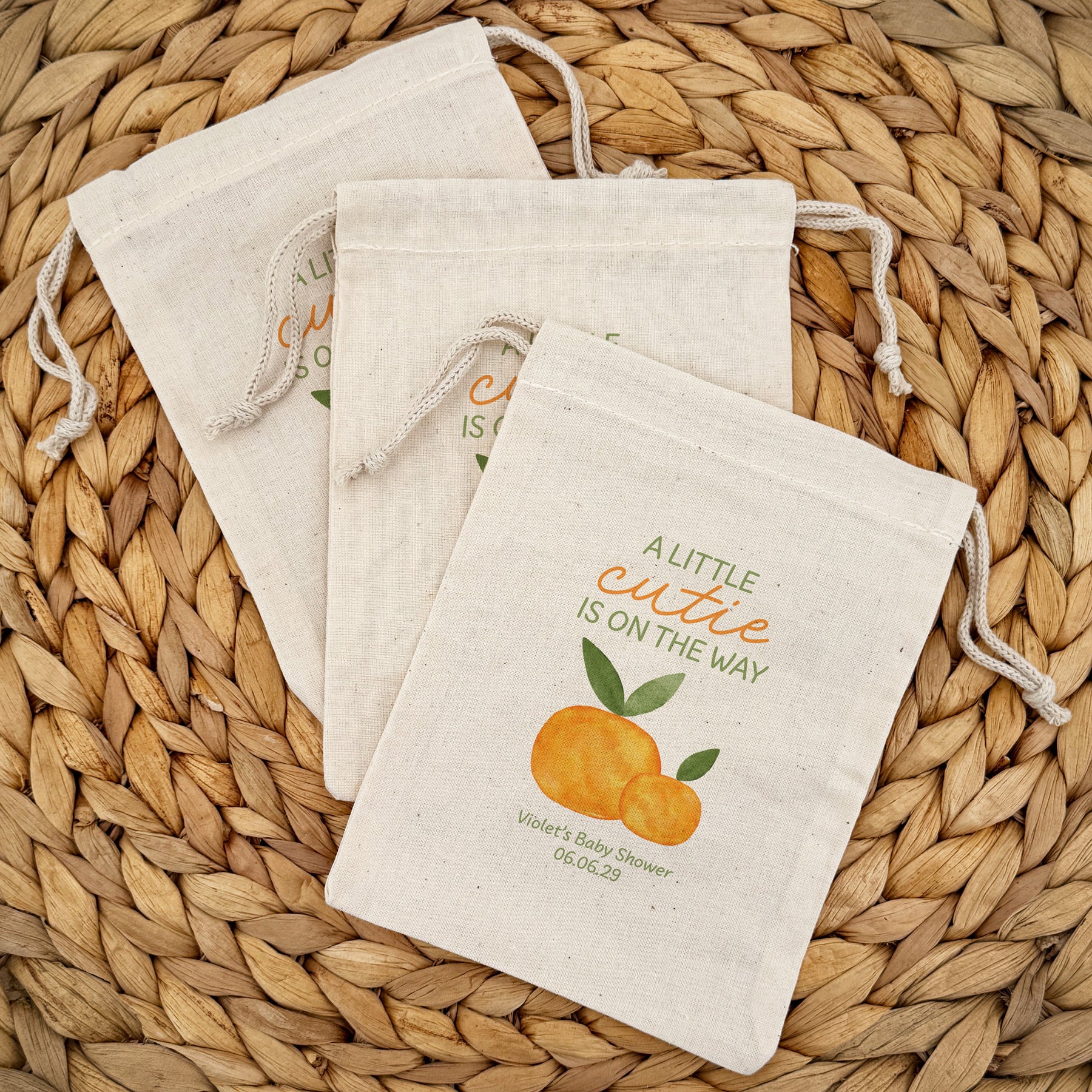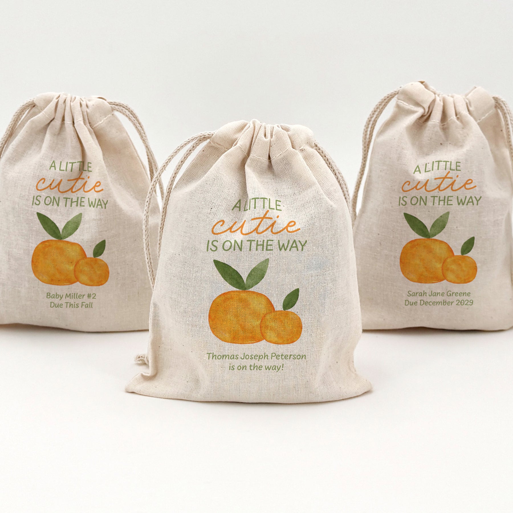 Cotton drawstring bags designed with "A little cutie is on the way", two clementines, and customized with two lines of text for your baby shower. We offer them in two different sizes which makes them the perfect favor bag to store all of the goodies and favors for your guests.