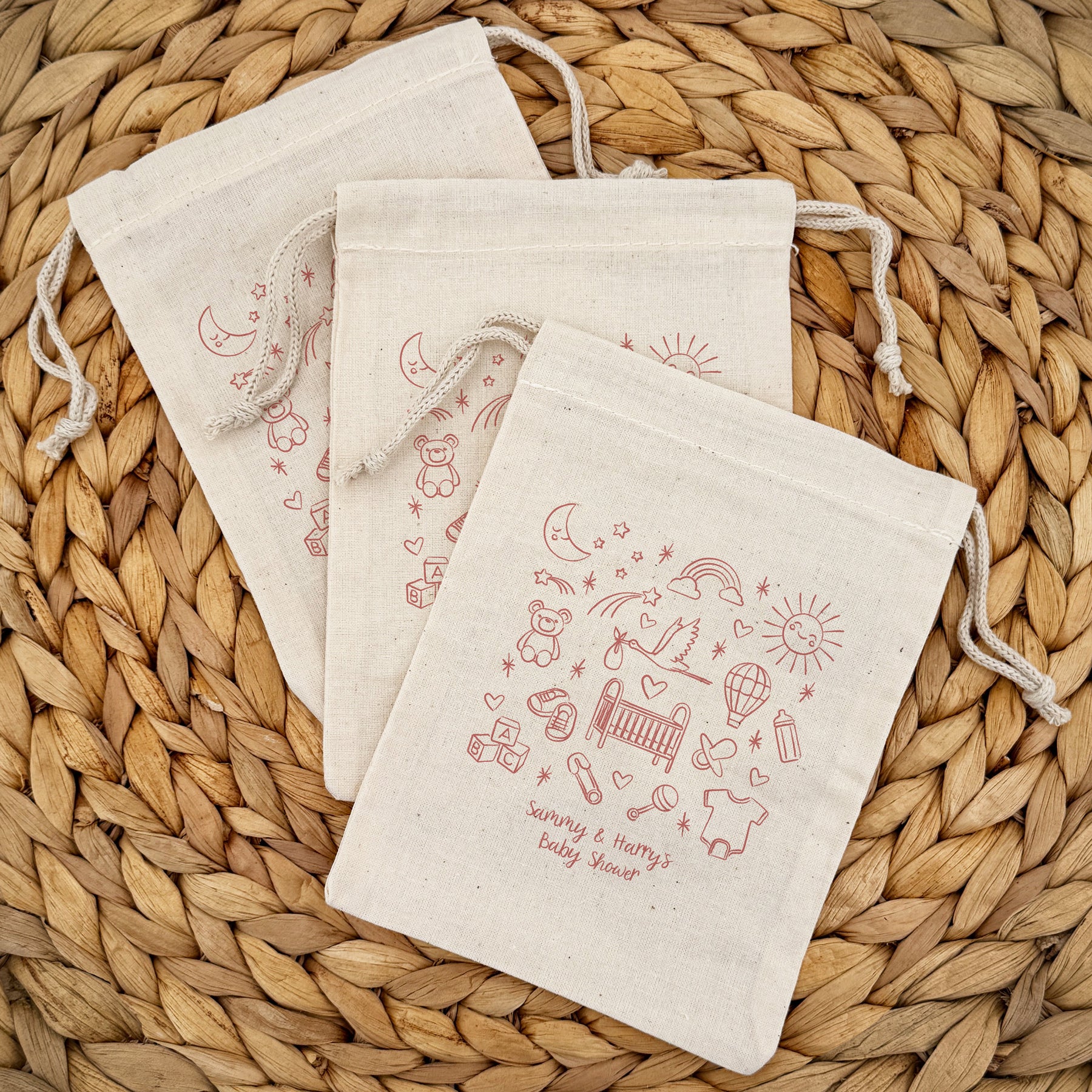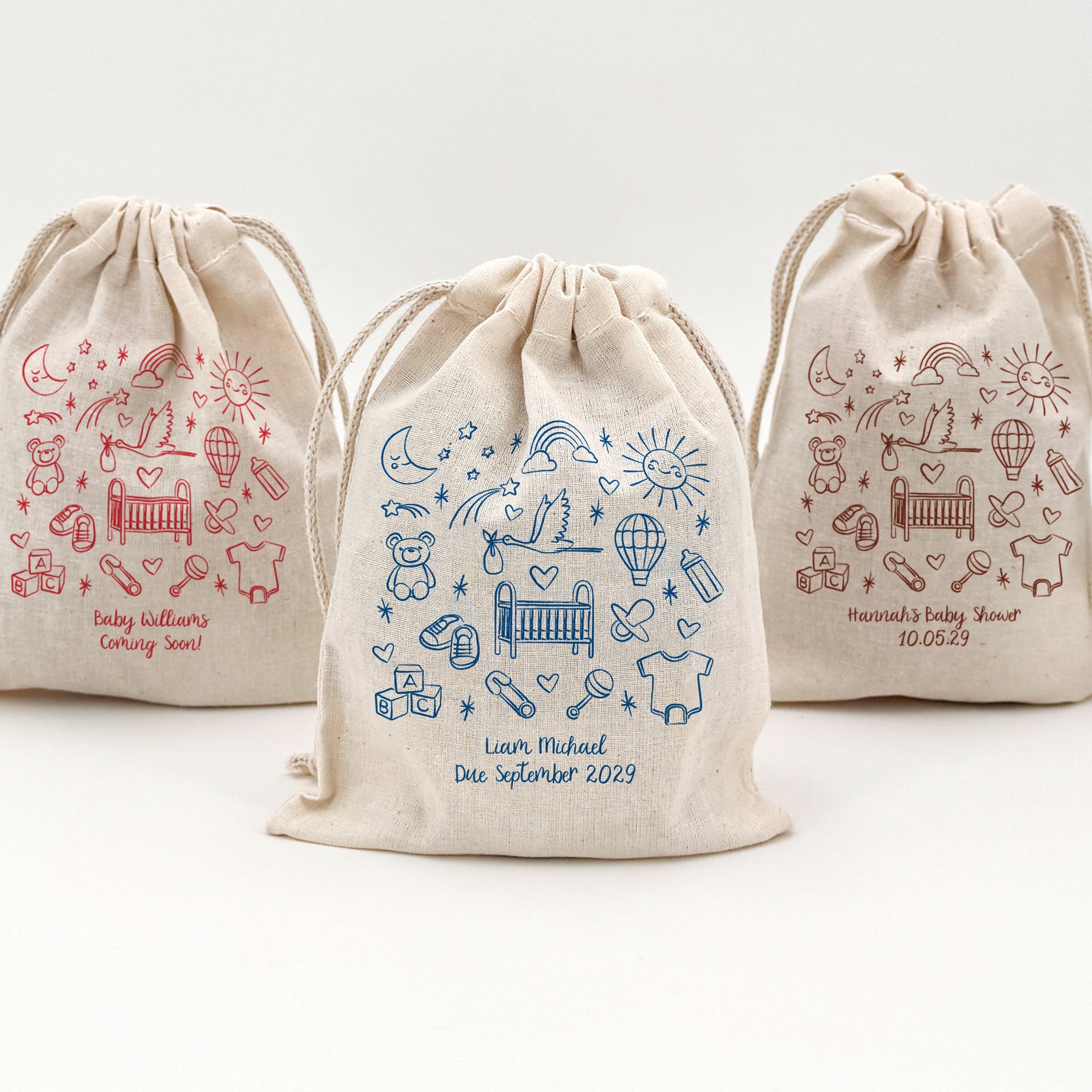 Mini cotton drawstring bags used as baby shower favors or gender reveal parties. Our adorable baby icon doodles on our cotton bags will make a perfect favor for any baby shower or gender reveal celebration. You can even customize our bags with two lines of personalized text.