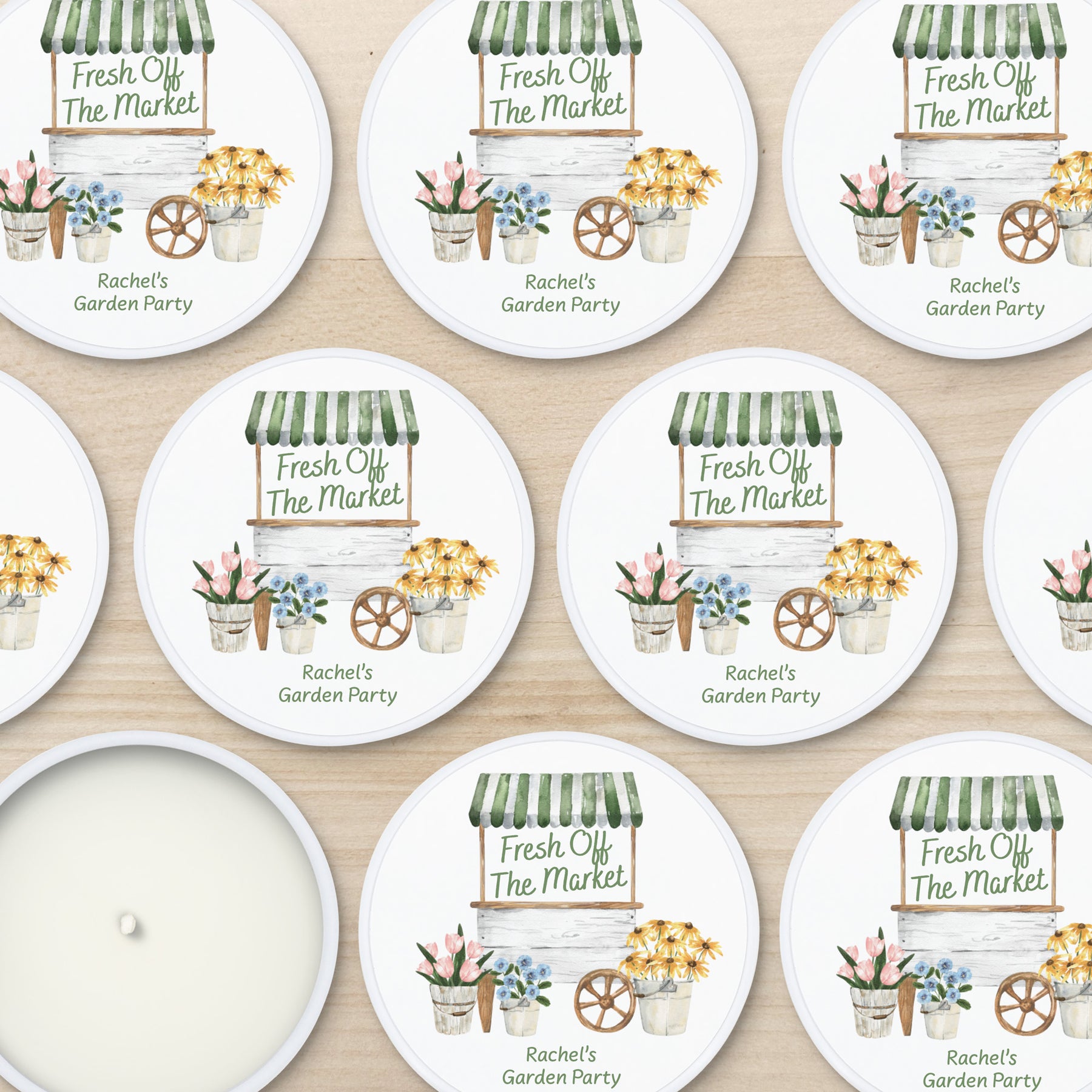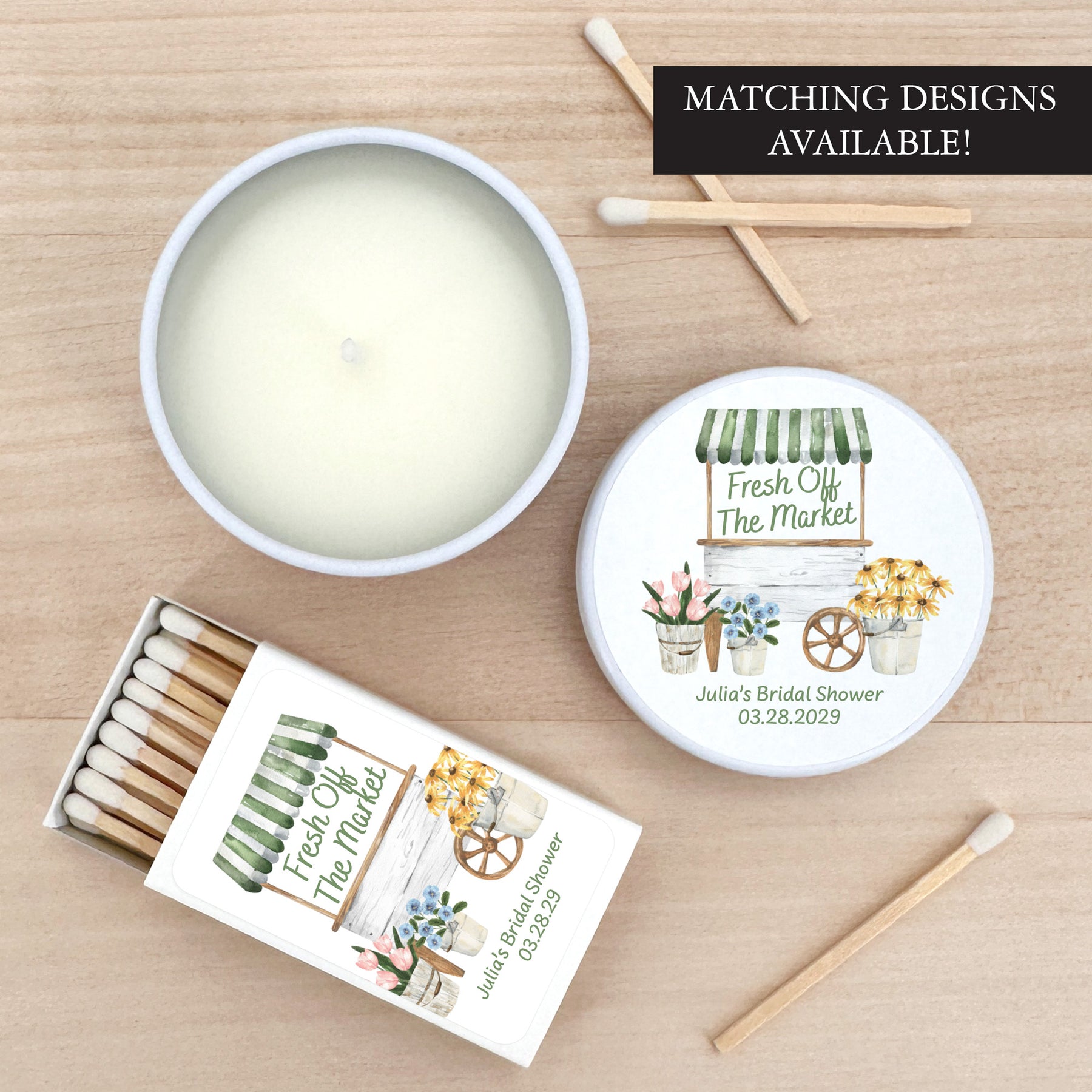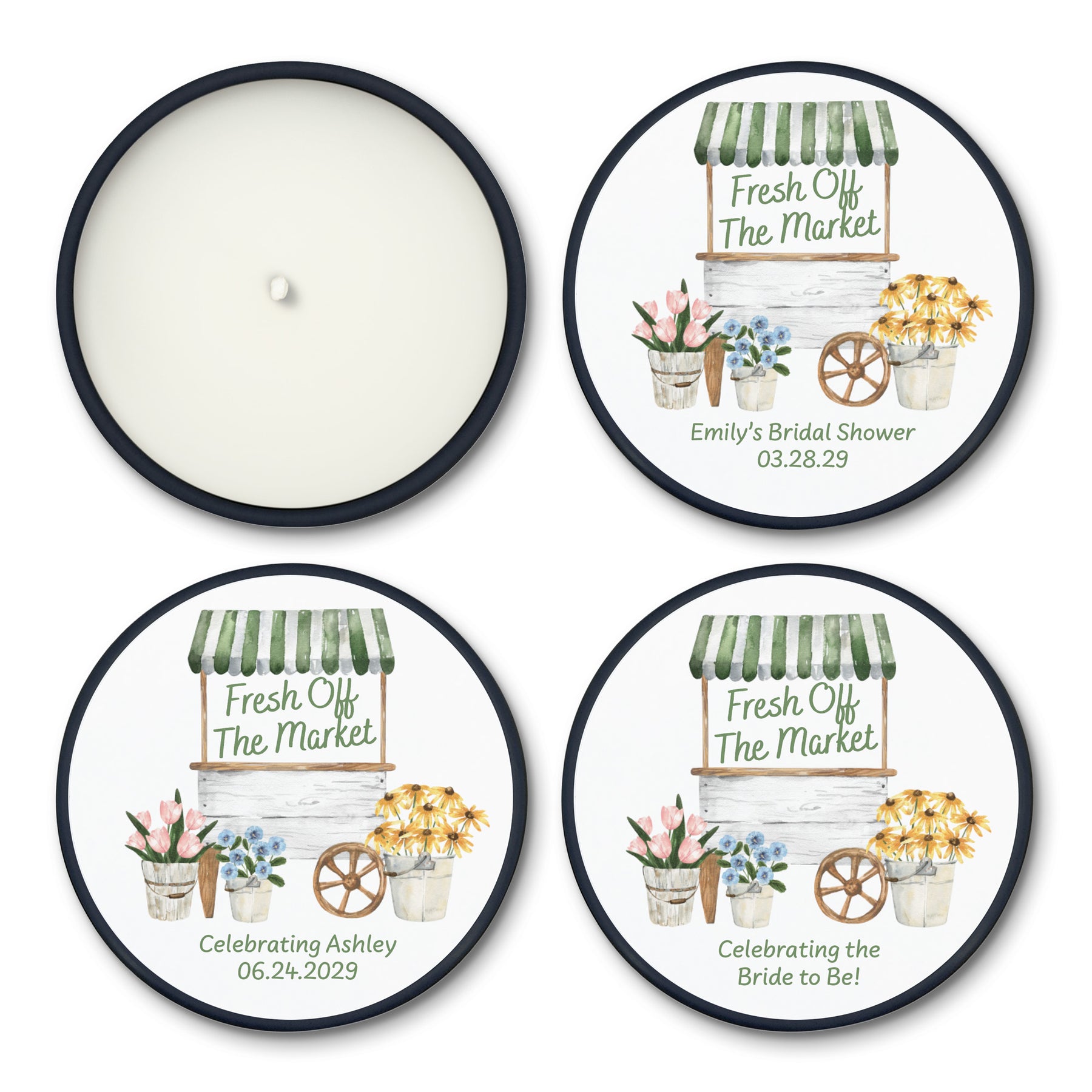 Fresh off the Market mini candle favors personalized for a bridal shower. Mini personalized candle favors are the perfect gift for your guests. The flower cart with the sign that says "Fresh off the Market" is a fun theme for the bridal shower.
