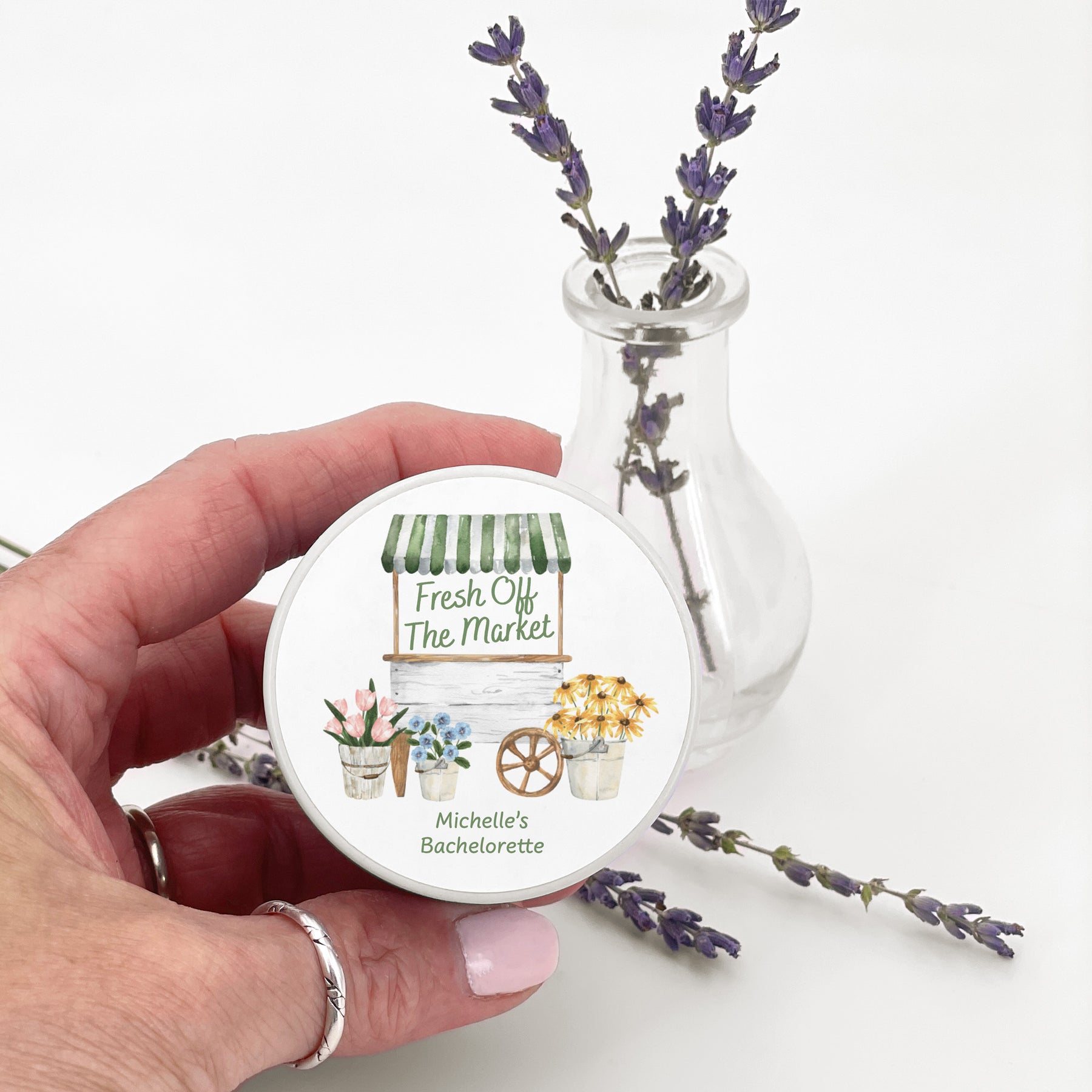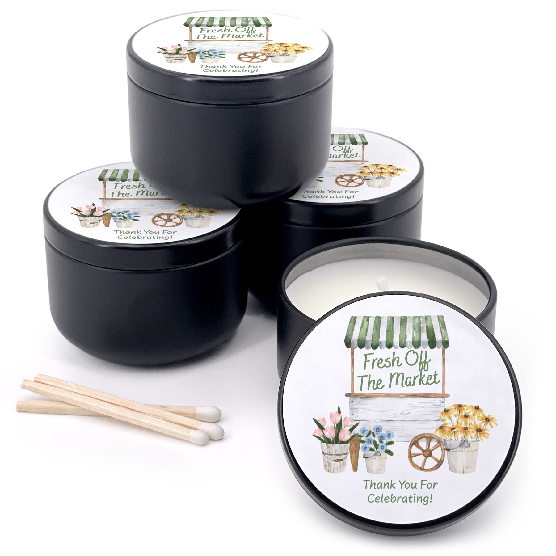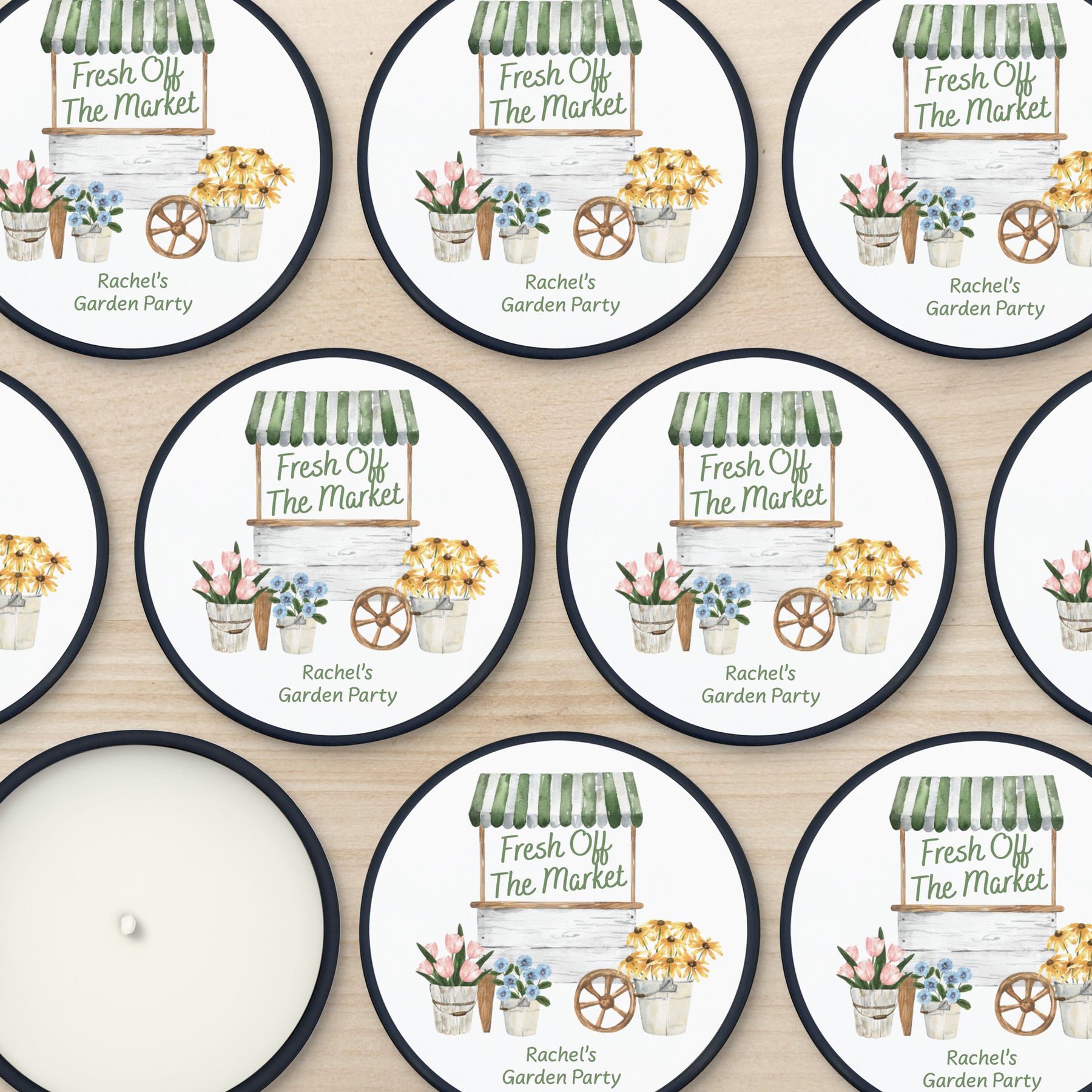 Fresh off the Market mini candle favors personalized for a bridal shower. Mini personalized candle favors are the perfect gift for your guests. The flower cart with the sign that says "Fresh off the Market" is a fun theme for the bridal shower.