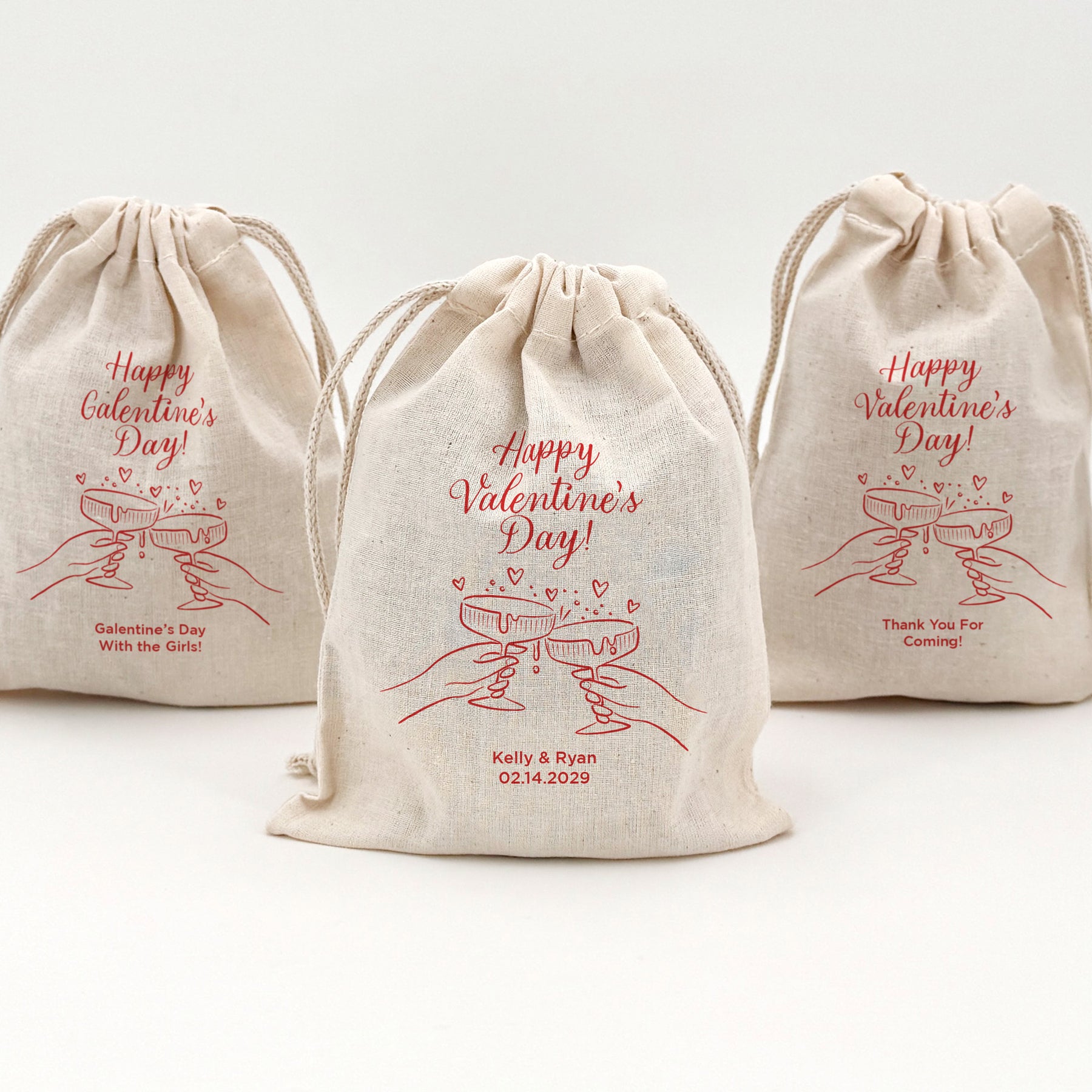 Cotton favor bags personalized with our hand drawn design of two toasting cocktail glasses including the heading "Happy Valentine's Day" or "Happy Galentine's Day" and two lines of custom text. This fun party design will make a perfect gift for your Valentine or Galentine!