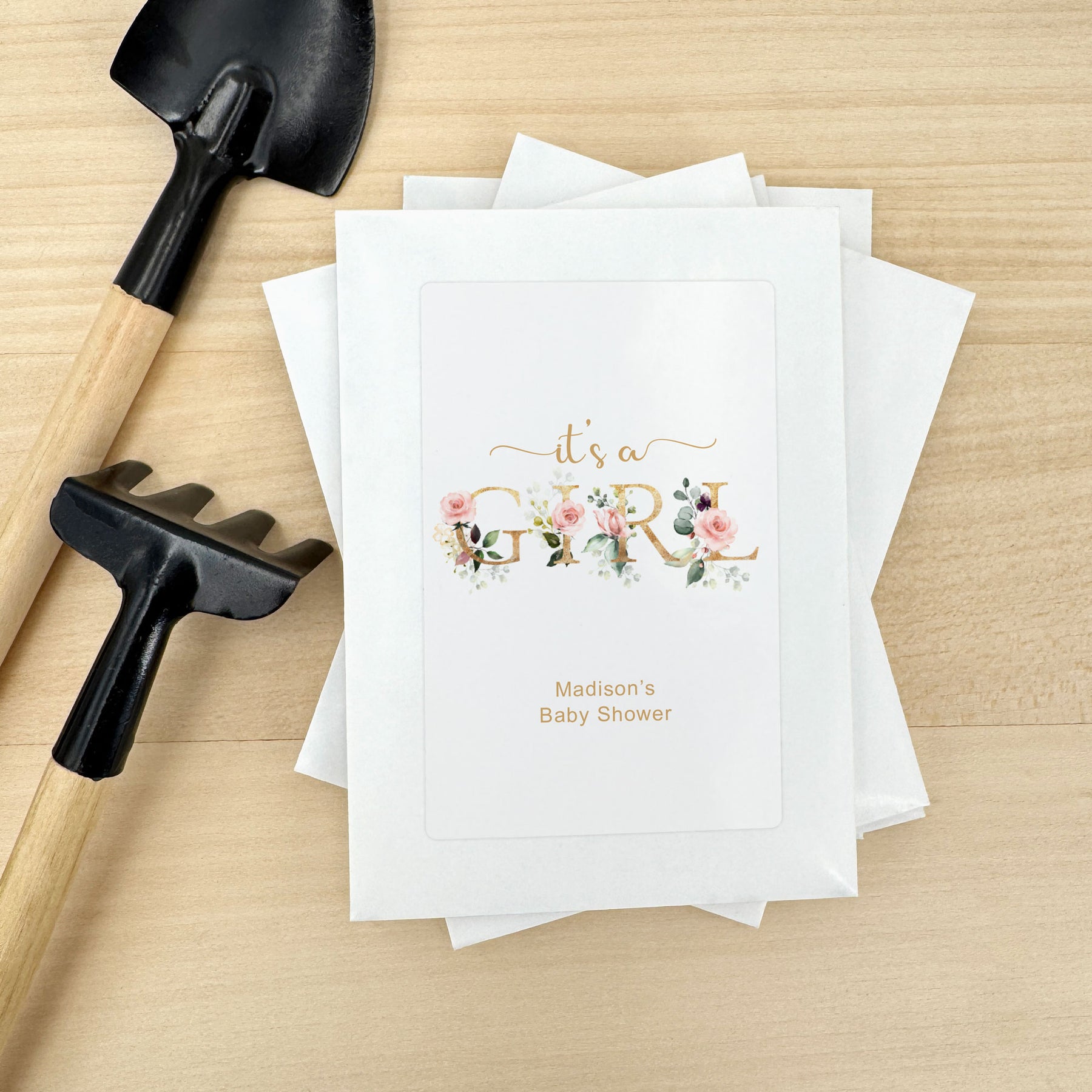 It's a Girl themed seed packet favors personalized for your guests at your baby shower. As the seeds grow, it creates an all natural and memorable way to remember your special day.
