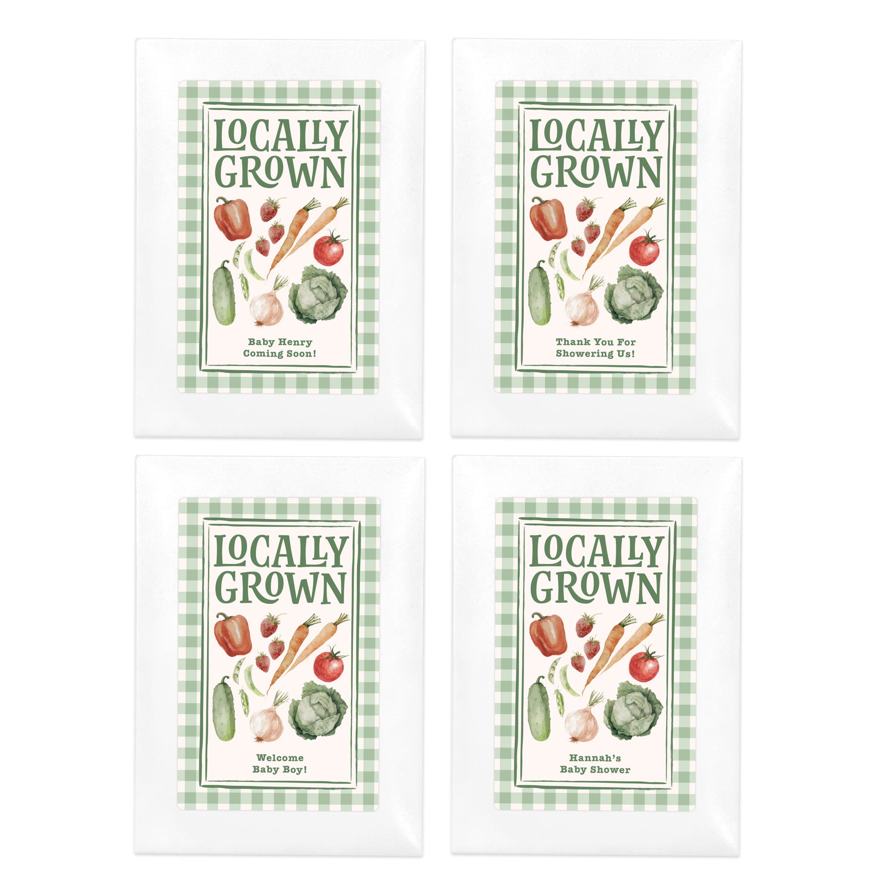 "Locally Grown" themed seed packet favors personalized for your guests at your baby shower. As the seeds grow, it creates an all natural and memorable way to remember your special day.