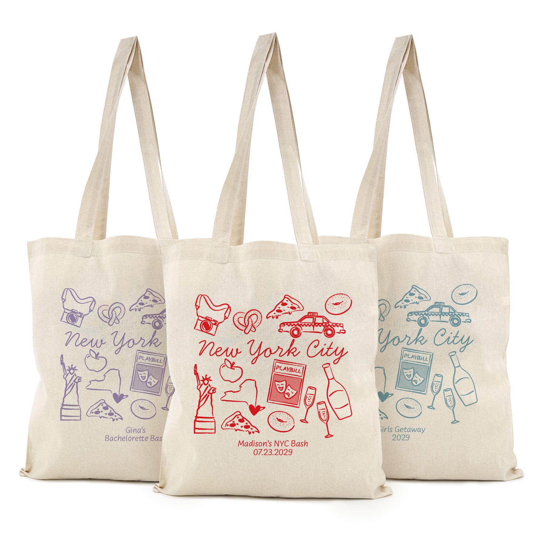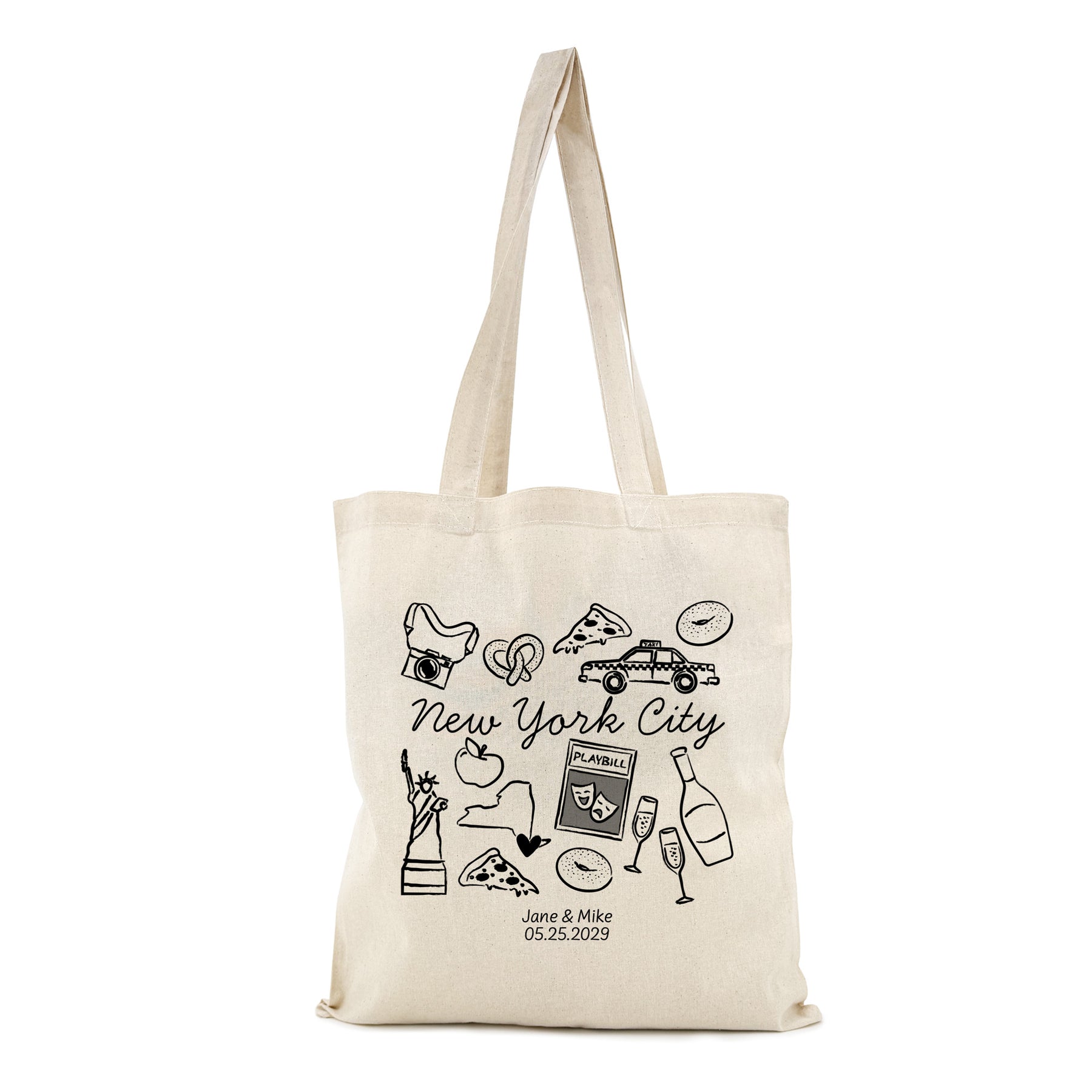 Cotton tote bag (15" x 16") used as a bachelorette goodie bag for your bridesmaids and guests or girls trip. We have included festive and fun icons featuring all of the things you can do in New York City; for example watch a Broadway production, enjoy NYC style pizza, and enjoy speakeasy-style bars with your family and friends.