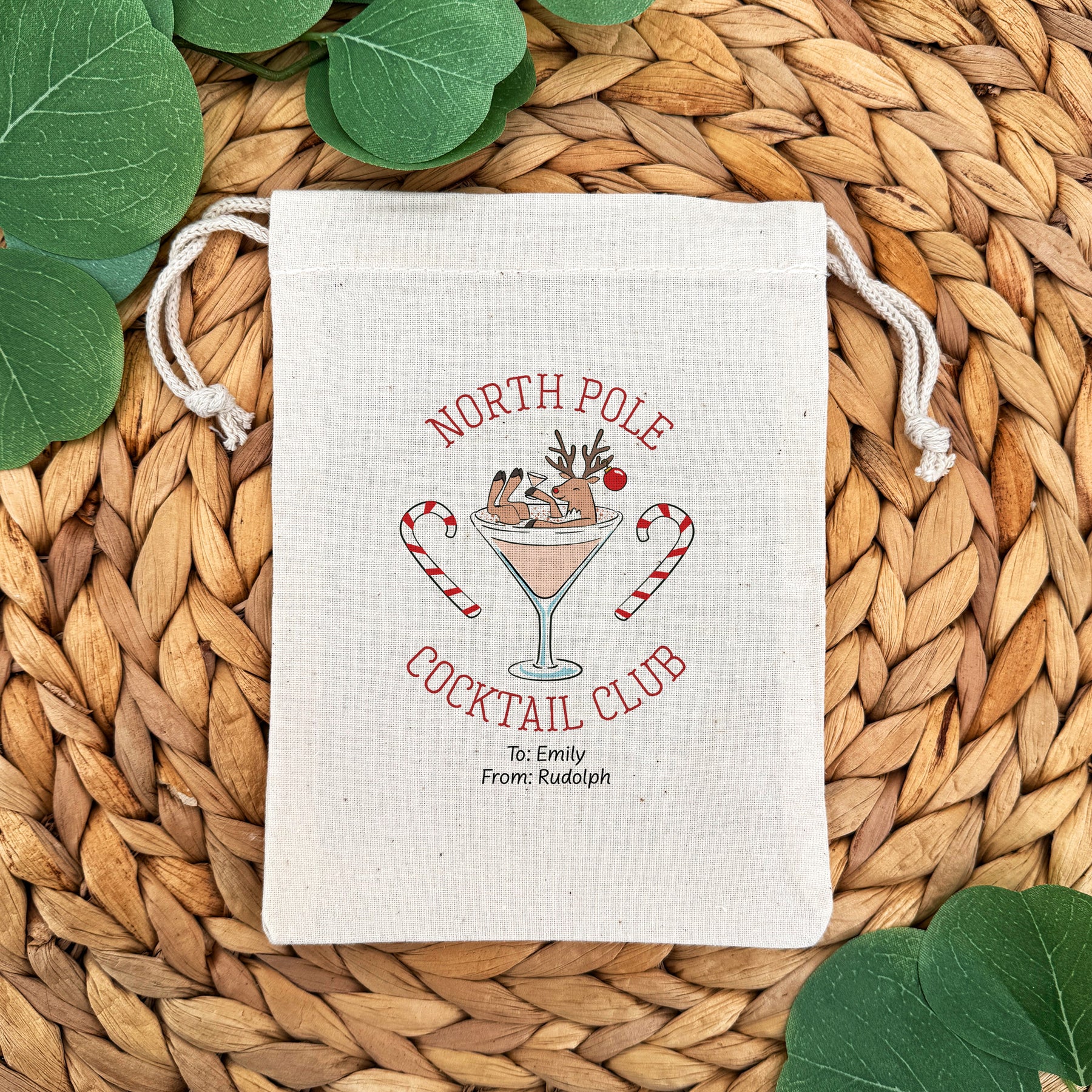 Custom mini drawstring bag with a Reindeer hanging out in a cocktail glass along with two lines of custom text. You have fun headings to choose from including: