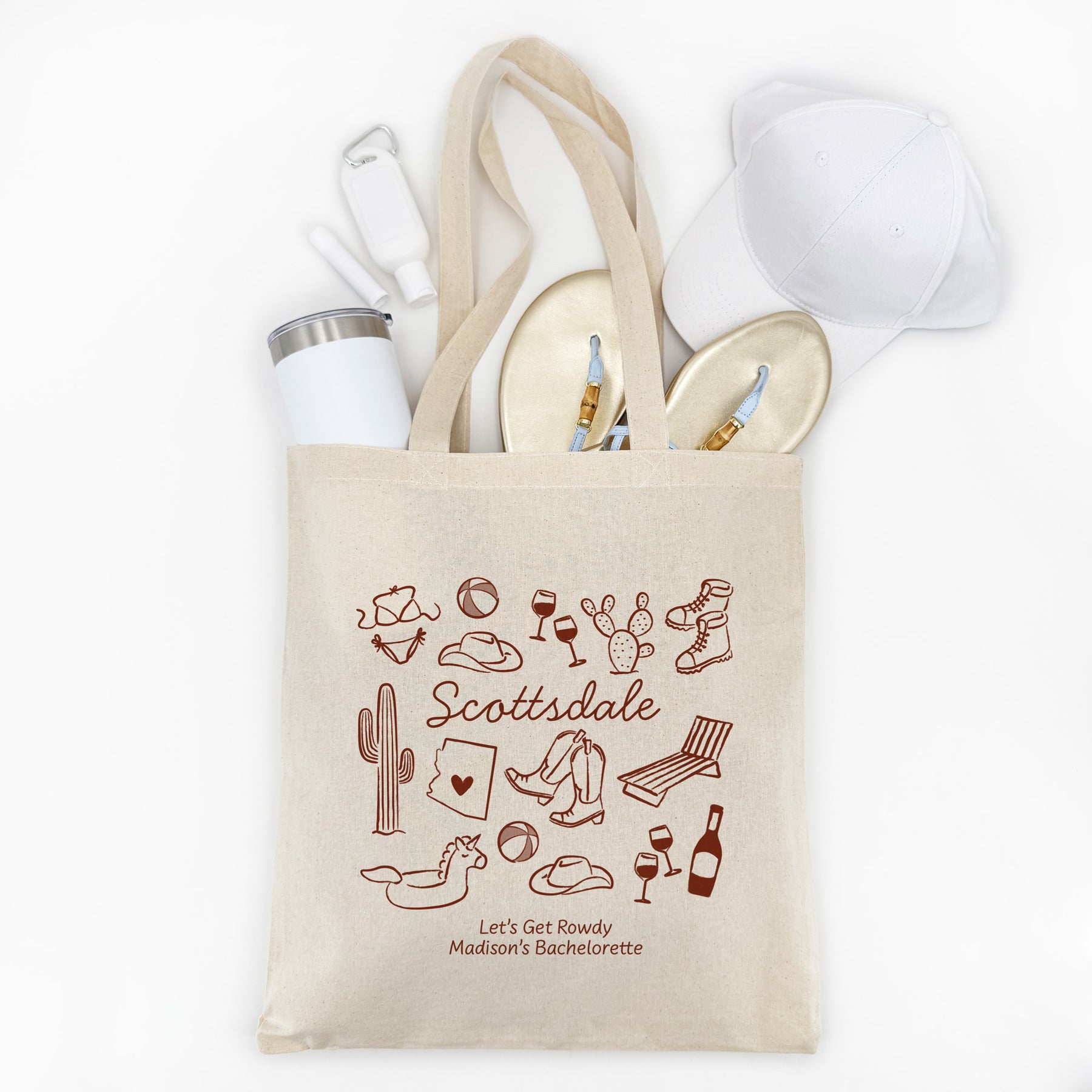 Cotton tote bag (15" x 16") used as a bachelorette goodie bag for your bridesmaids and guests or girls trip. We have included festive and fun icons featuring all of the things you can do in Scottsdale; for example visit Camelback Mountain, check out the wineries, or book a pedal pub tour with your family and friends.