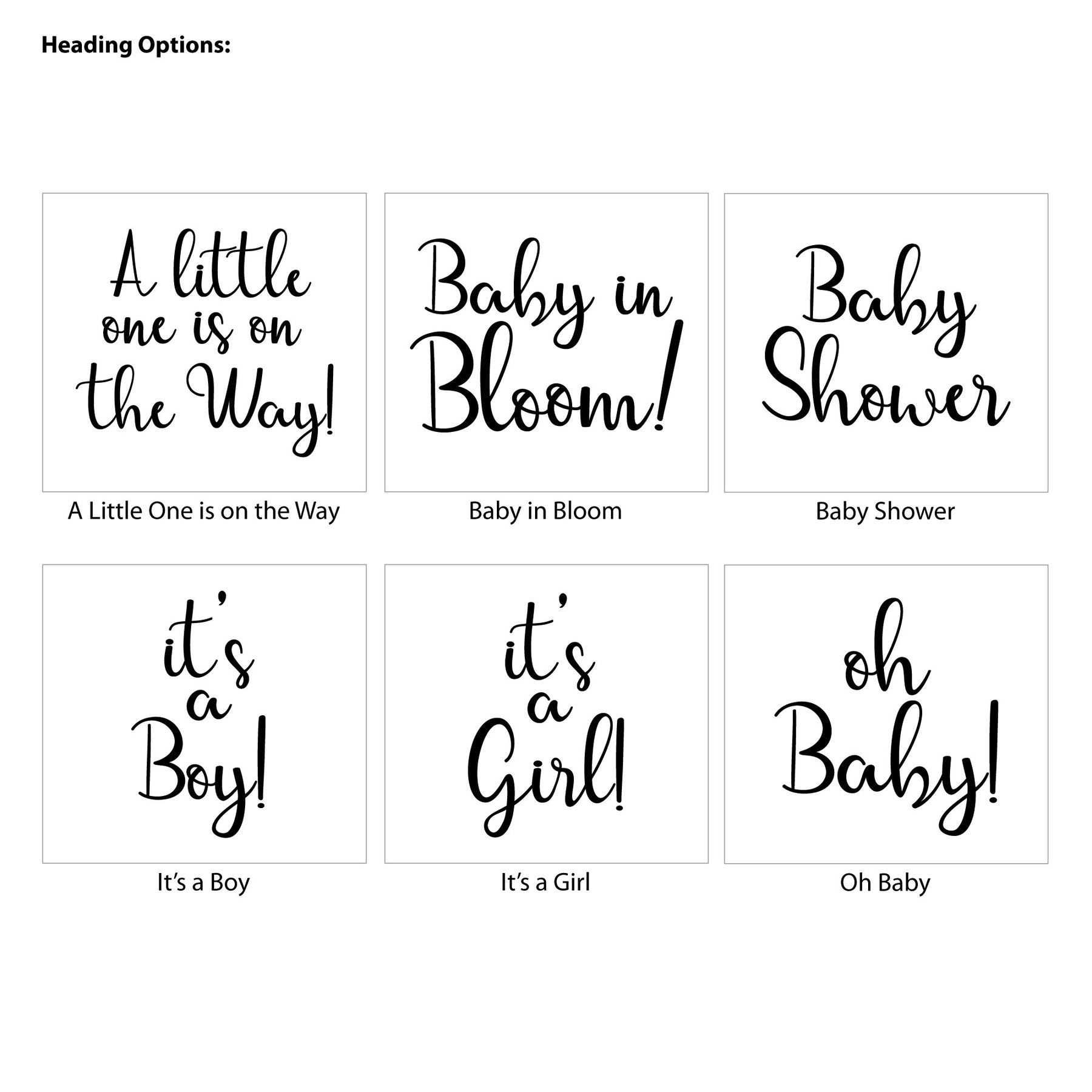Check out the different headings you can choose: Baby in Bloom, It's A Boy, It's A Girl, Baby Shower, Oh Baby, and A little one is on the Way. All of this is personalized just for you! Check out the other products we offer to match..... life saver mints, tea, hot chocolate, honey etc.