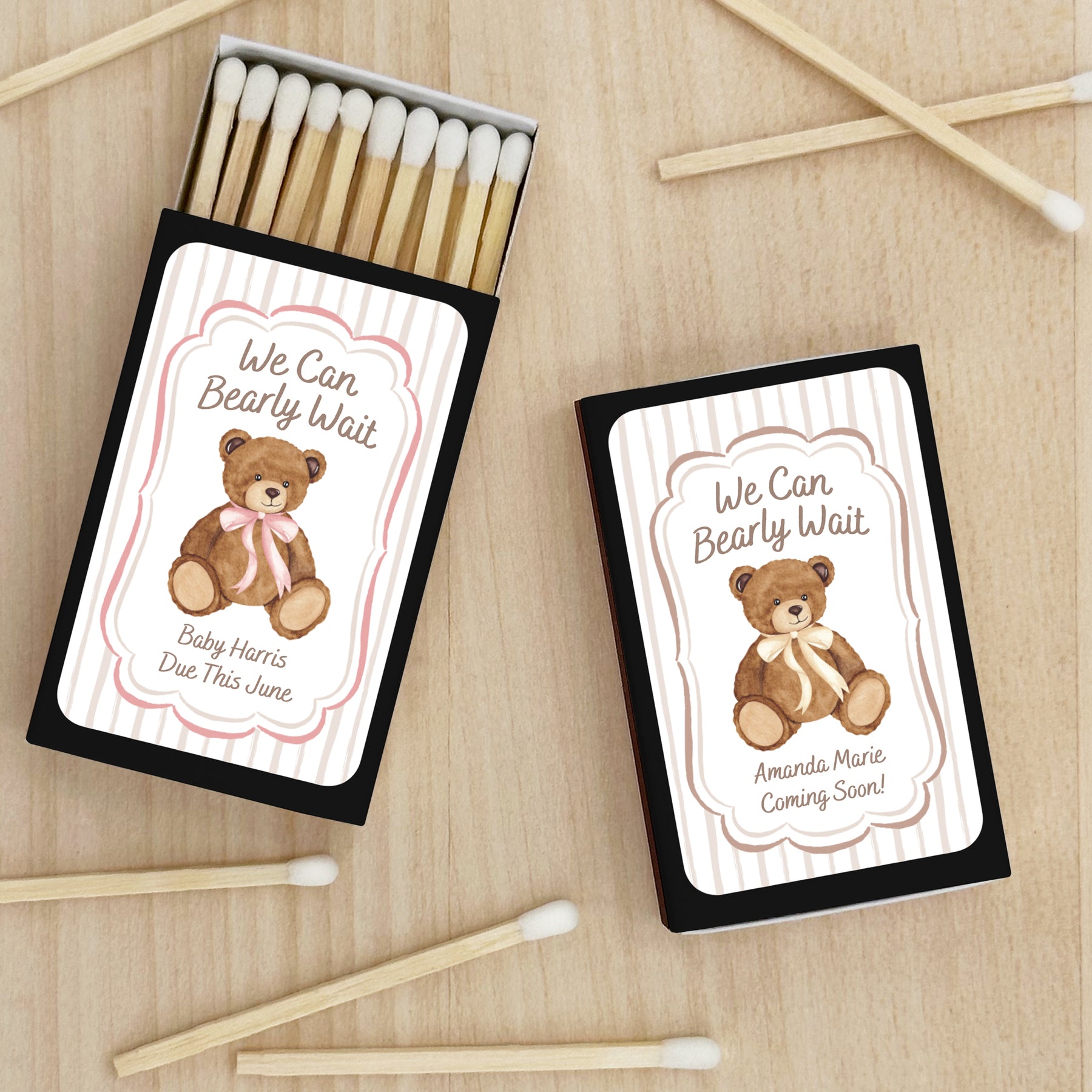 Watercolor brown bear design with a heading that says "We Can Bearly Wait" customized on our match boxes making them the perfect baby shower favor for your guests. This design enables you to choose the bear's bow color and frame color from brown to pink or blue. We also offer this design in many different products. Check out this design on honey jars and lip balm - just to name a few.