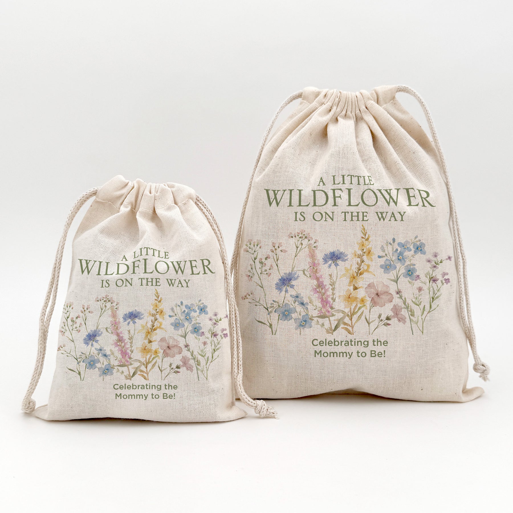 A Little Wildflower is on the Way cotton favor bags personalized for your baby shower. We offer the cotton drawstring bags two different sizes which makes them the perfect favor bag to store all of the goodies and favors for your guests.