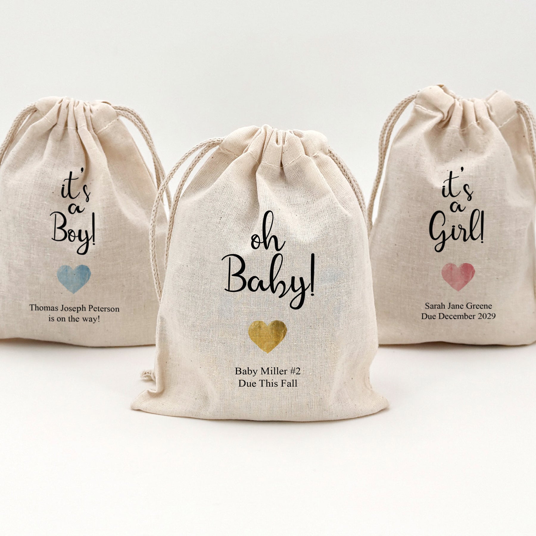 Mini cotton drawstring bags used as baby shower favors or gender reveal parties. Our simple faux foil heart and headings options on our cotton bags will make a perfect favor for any baby shower or gender reveal celebration. You can even customize our bags with two lines of personalized text.