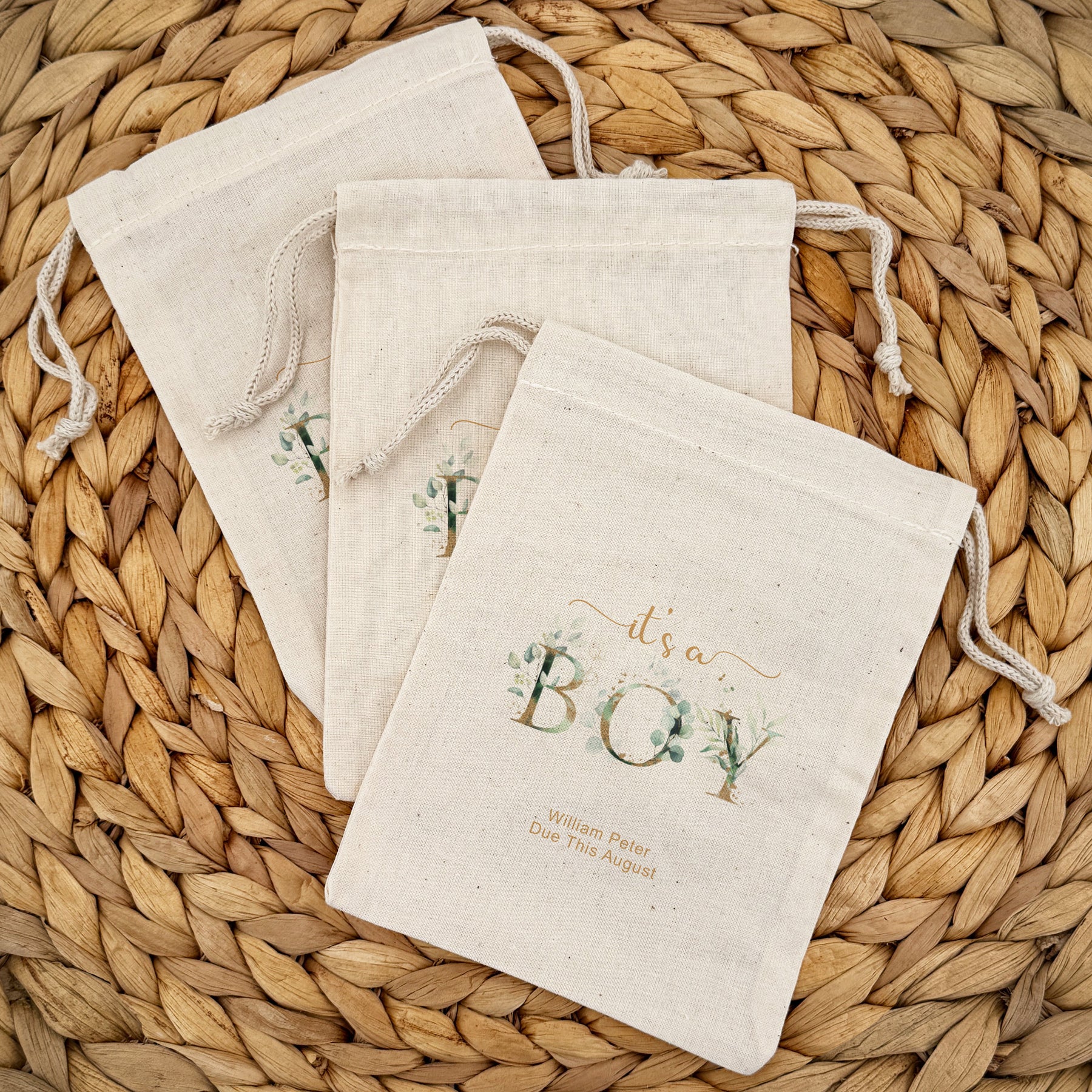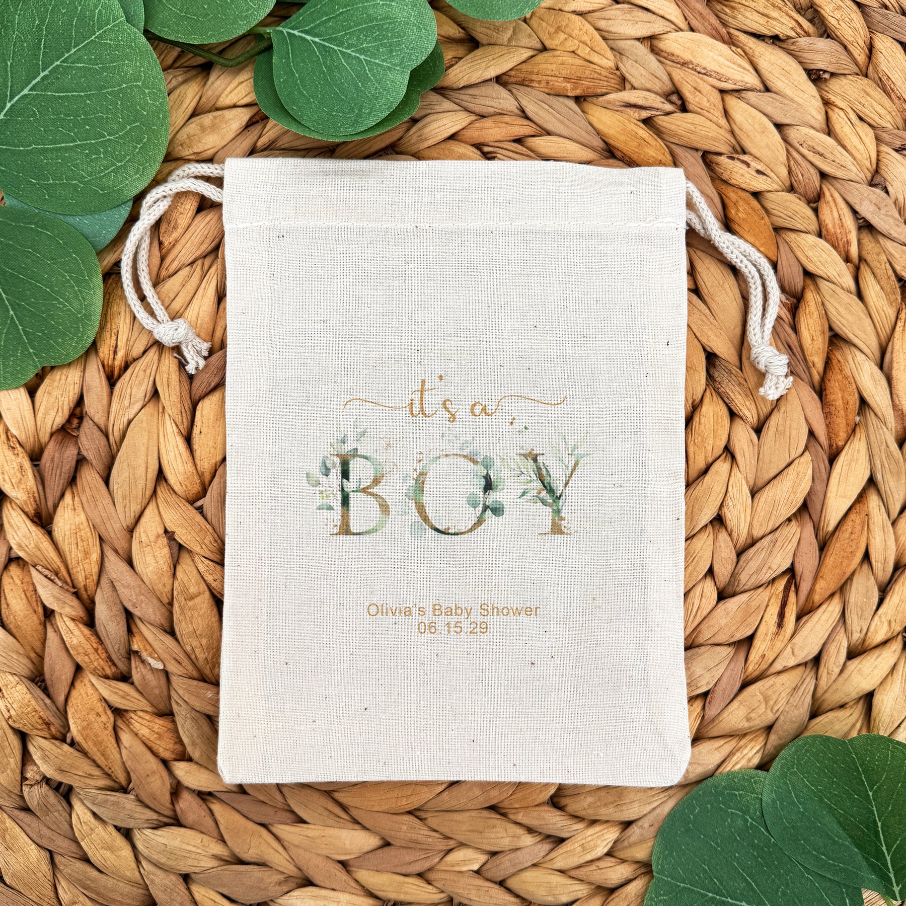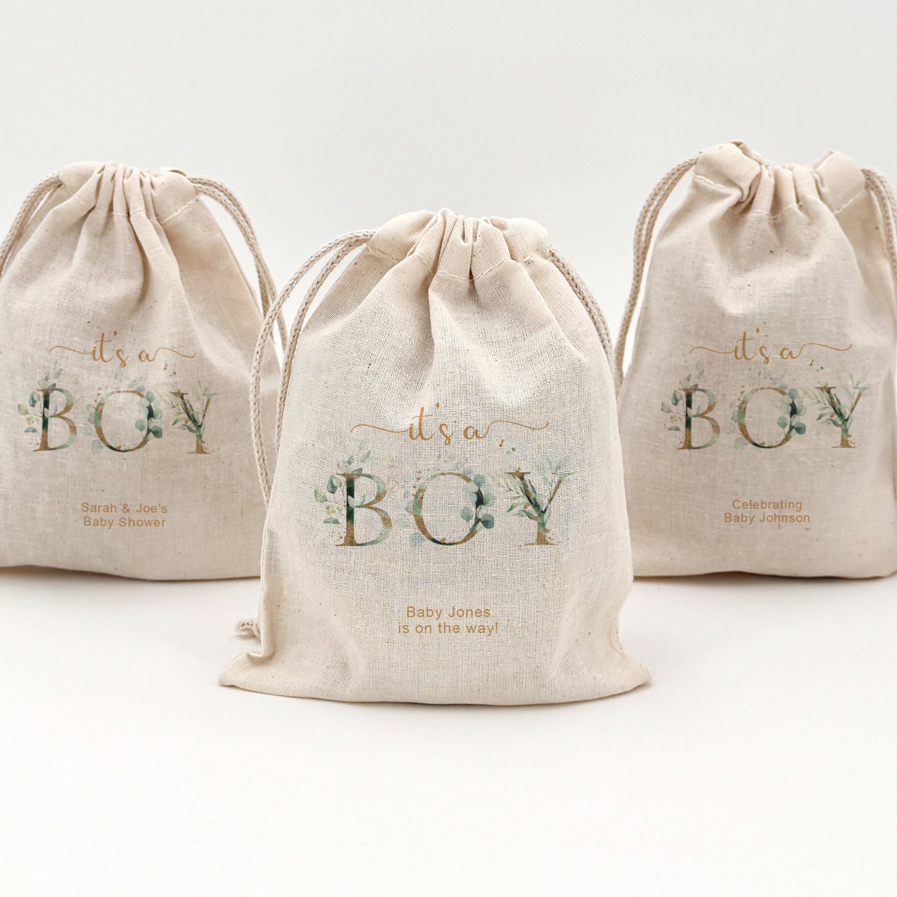 Mini cotton drawstring bags used as baby shower favors or gender reveal parties. Our beautiful watercolor eucalyptus that says It's a Boy can be customized with two lines of personalized text to work with your celebration.