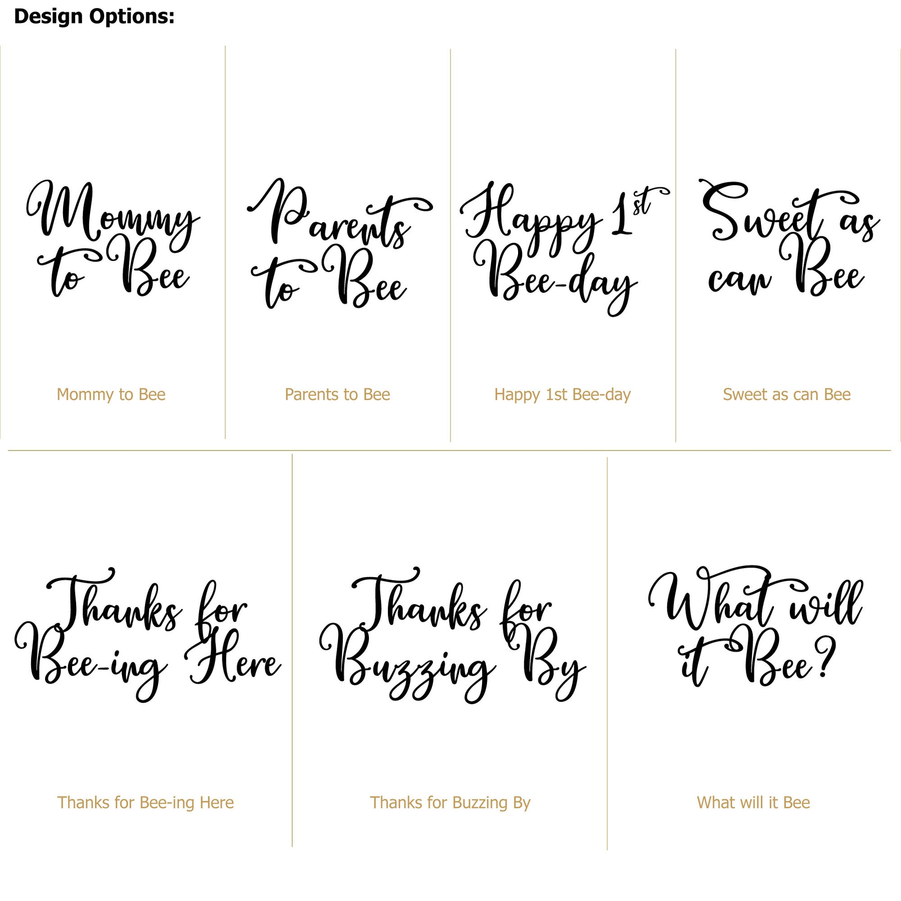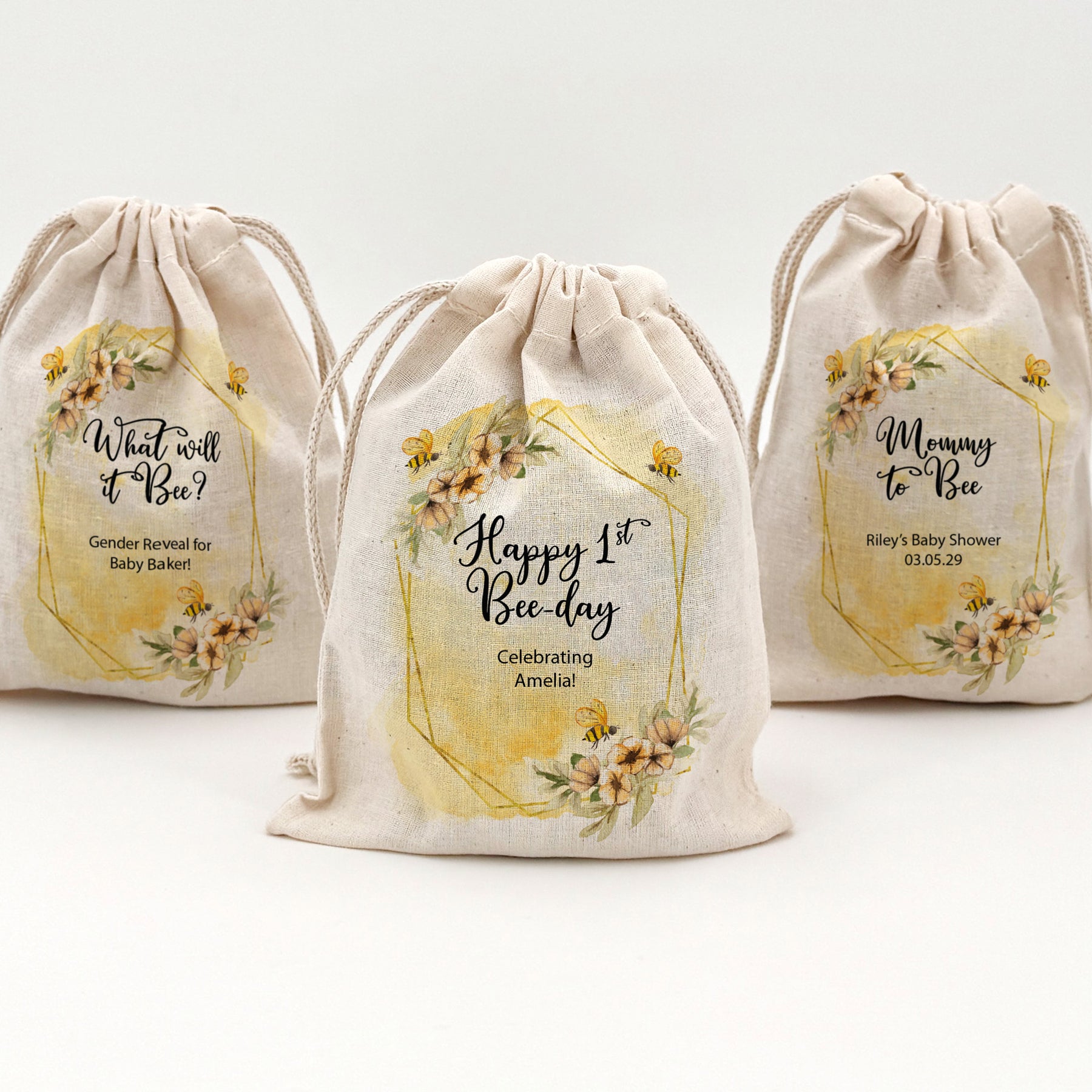 Mini cotton drawstring bags used as baby shower favors or gender reveal parties. Our adorable watercolor bees and yellow flowers on our drawstring bags will make a perfect favor for any honey themed baby shower. You can even customize our bags with two lines of personalized text.