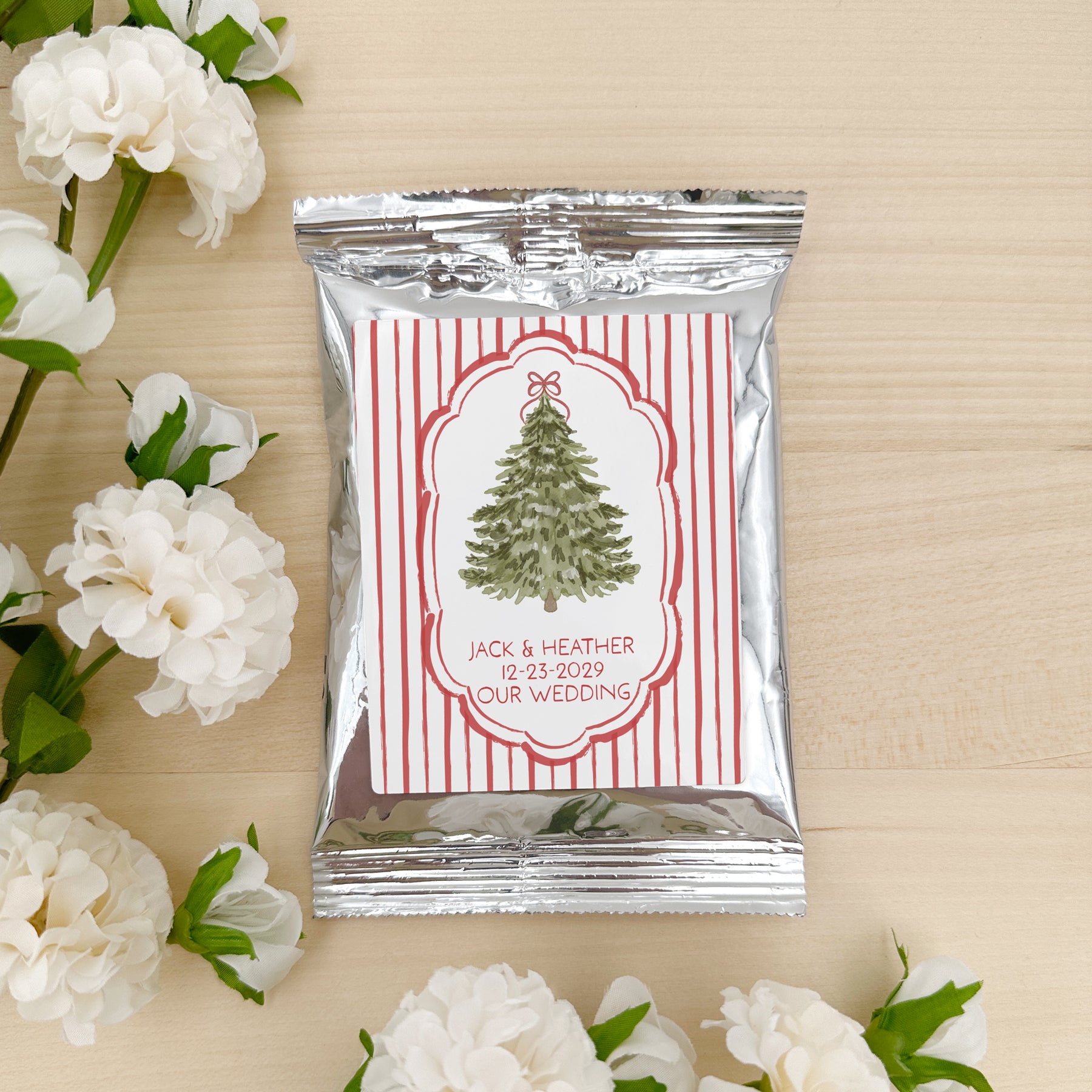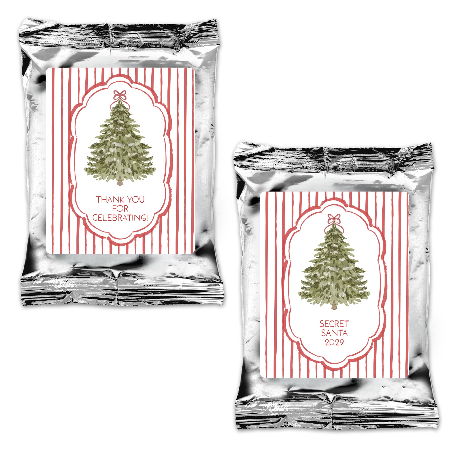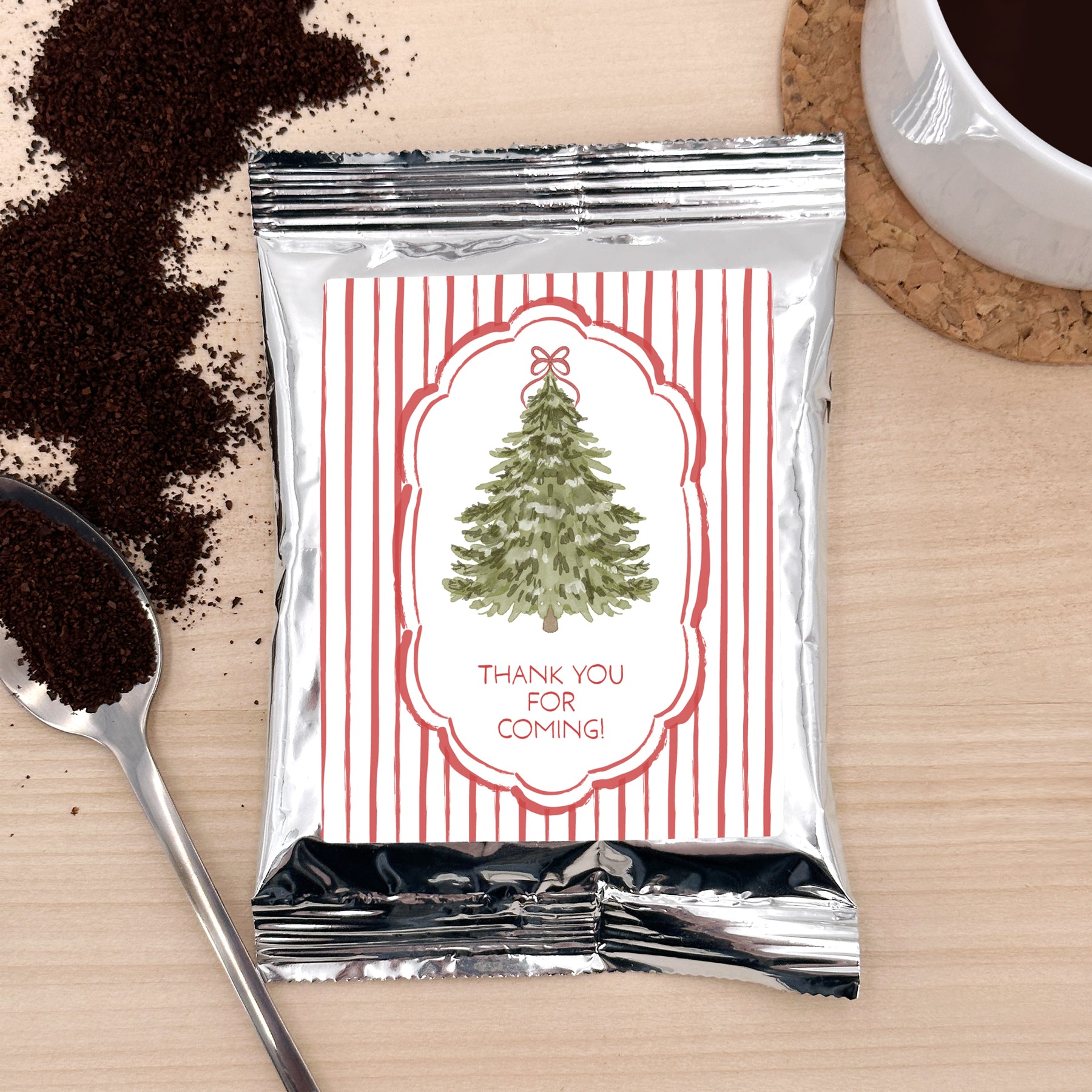Christmas Party favor coffee packs featuring a striped pattern and Christmas tree. Our perfectly blended coffee packets make a great gift or stocking stuffer.