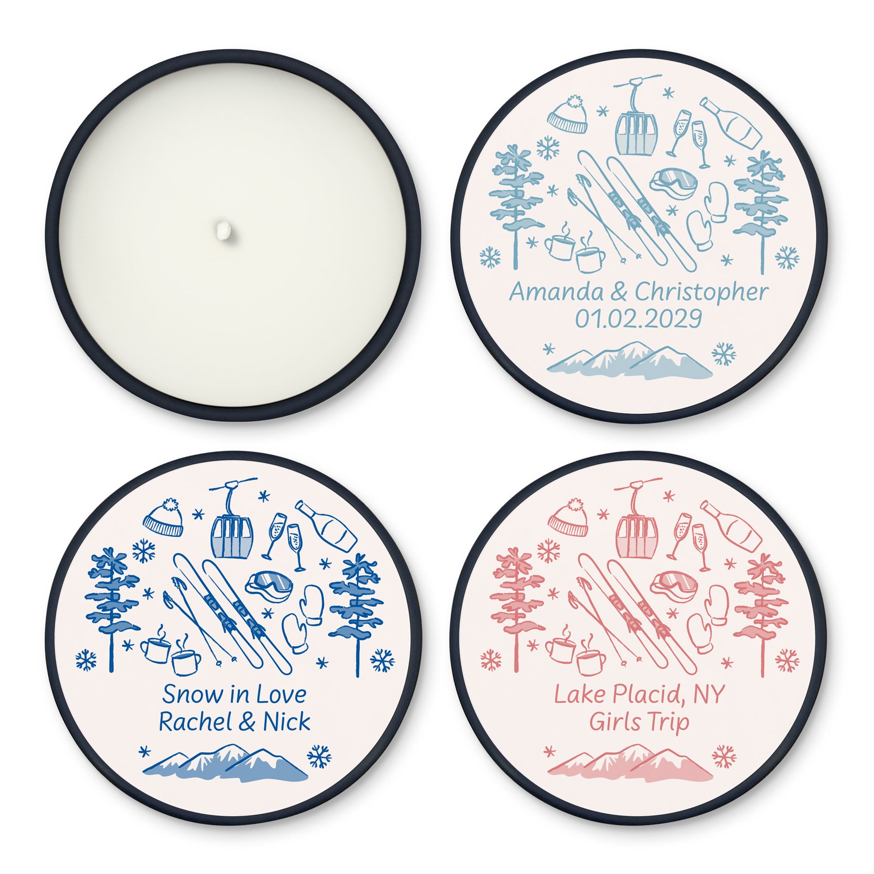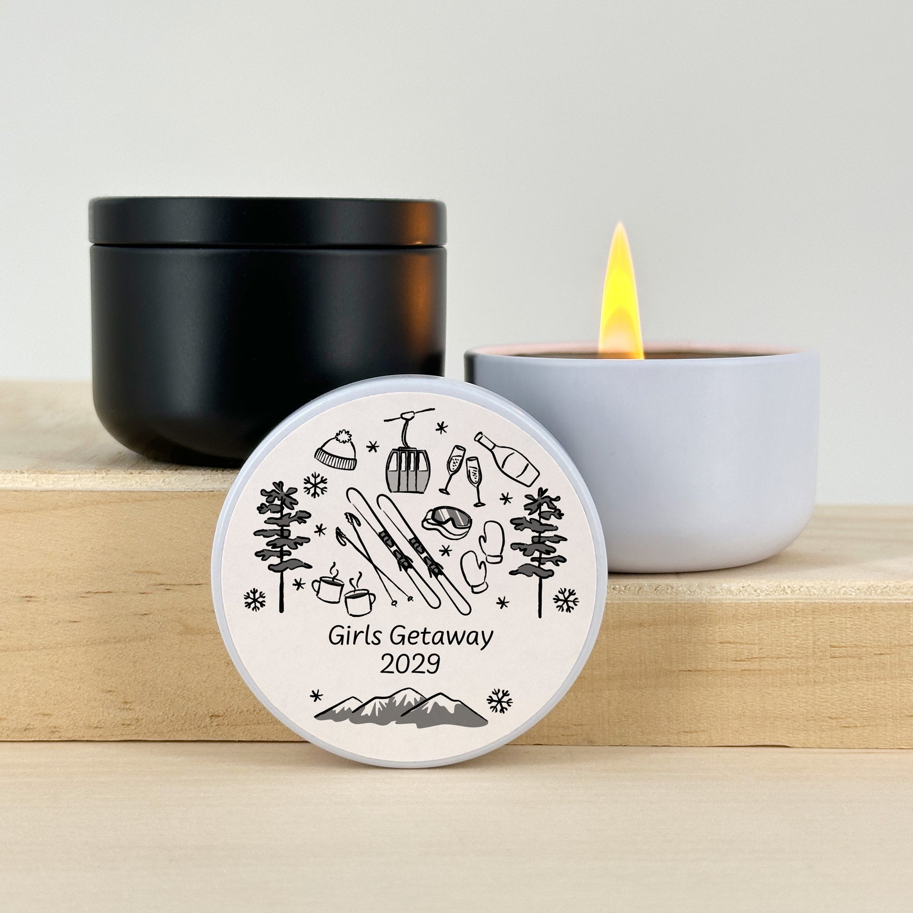 Ski inspired mini candles personalized as a favor or gift for your bachelorette party, wedding reception, birthday party, or girls’ weekend.
