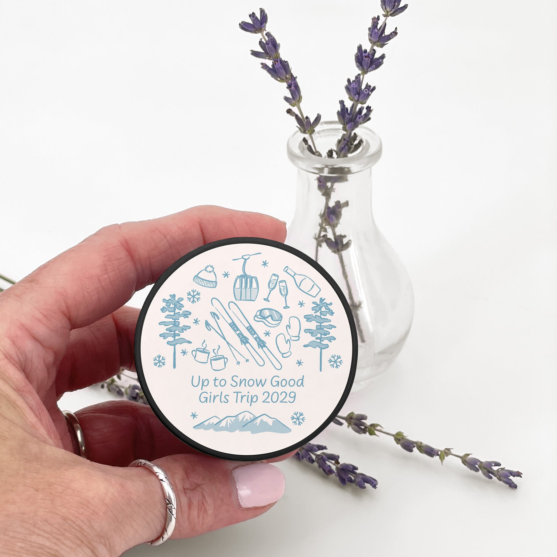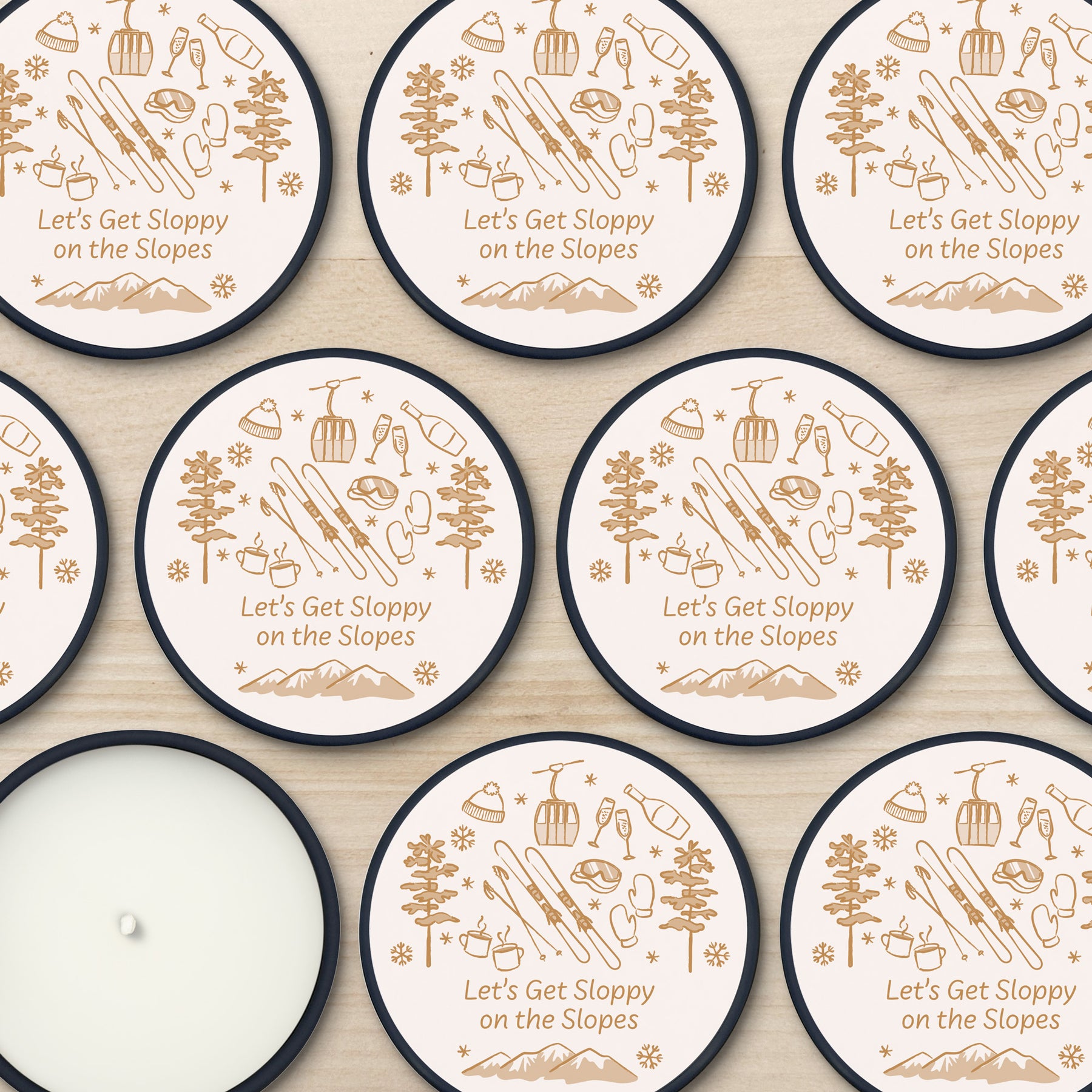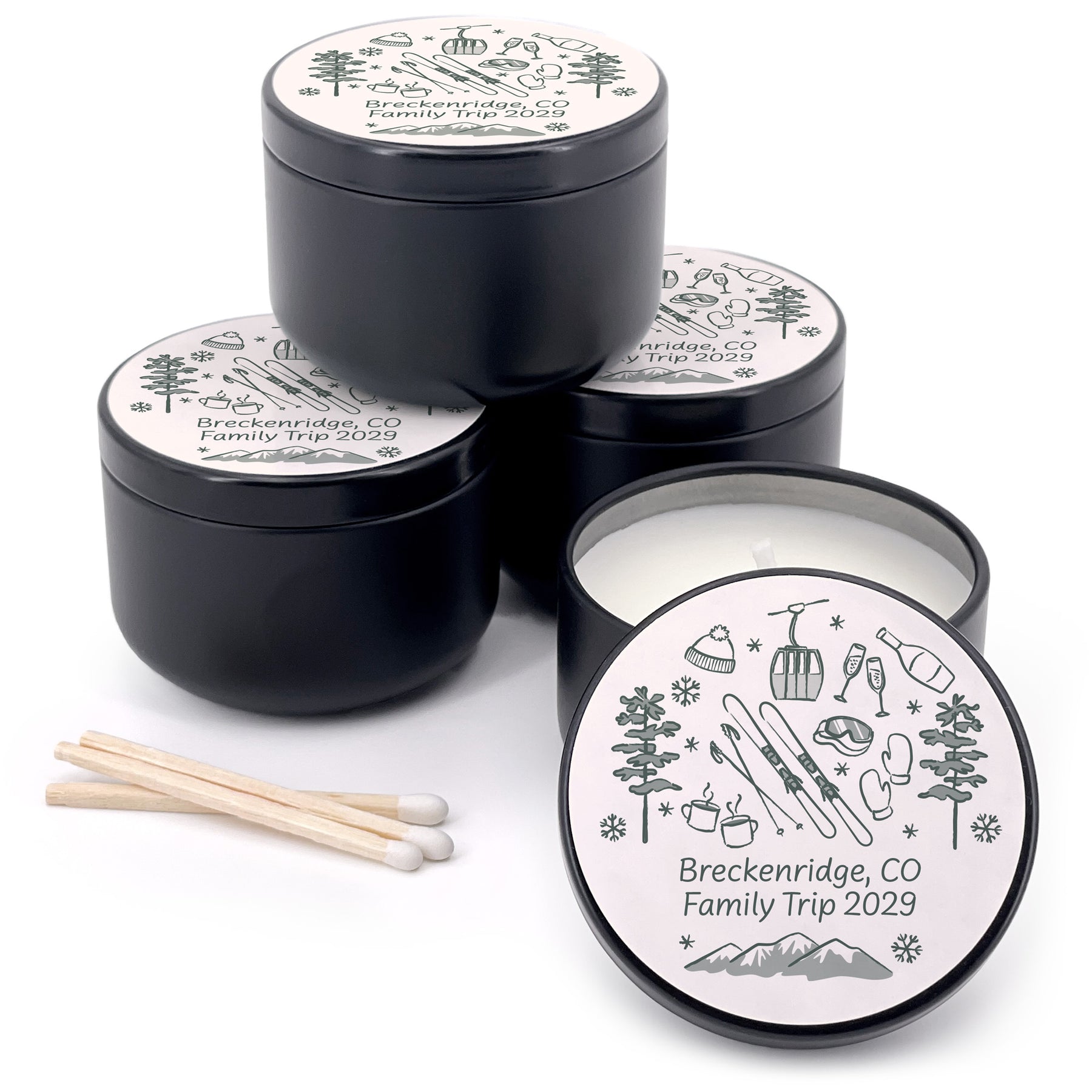 We hand drew ski trip inspired icons on our mini candle favors making them the perfect necessity for your bachelorette trip. In addition, the candles will make a nice gift to remember the fun times they had at the bachelorette party or birthday party. Since our candles are personalized, it gives you the opportunity to be fun and creative with the two lines of custom text.