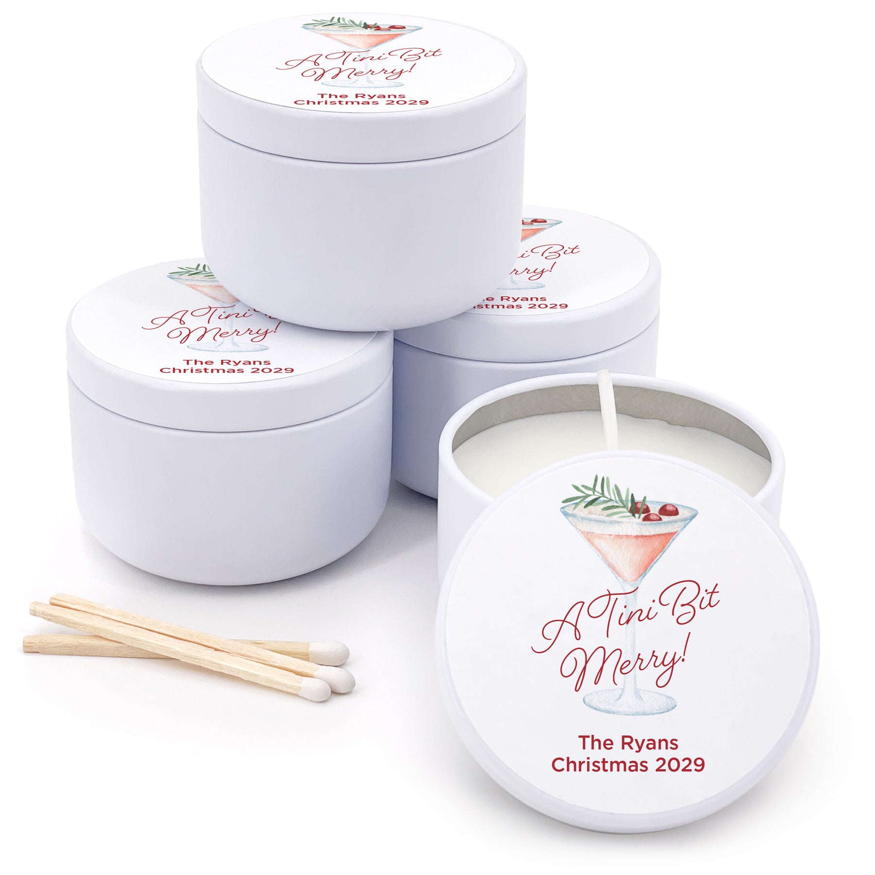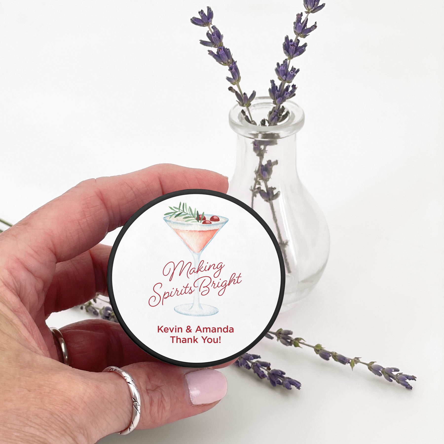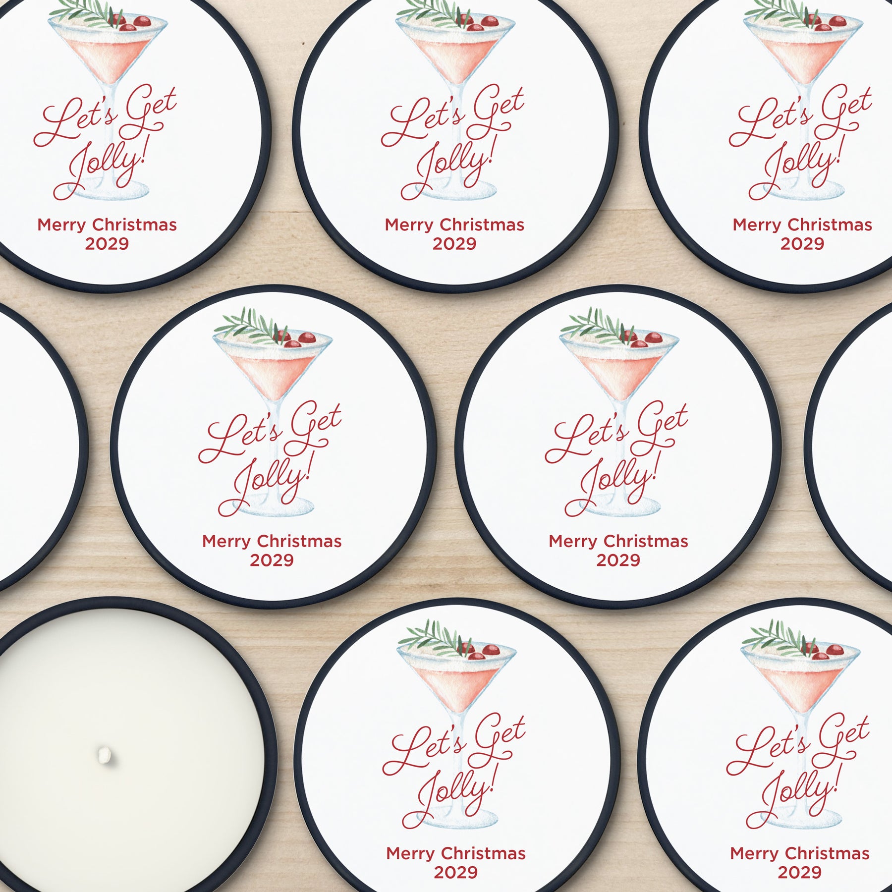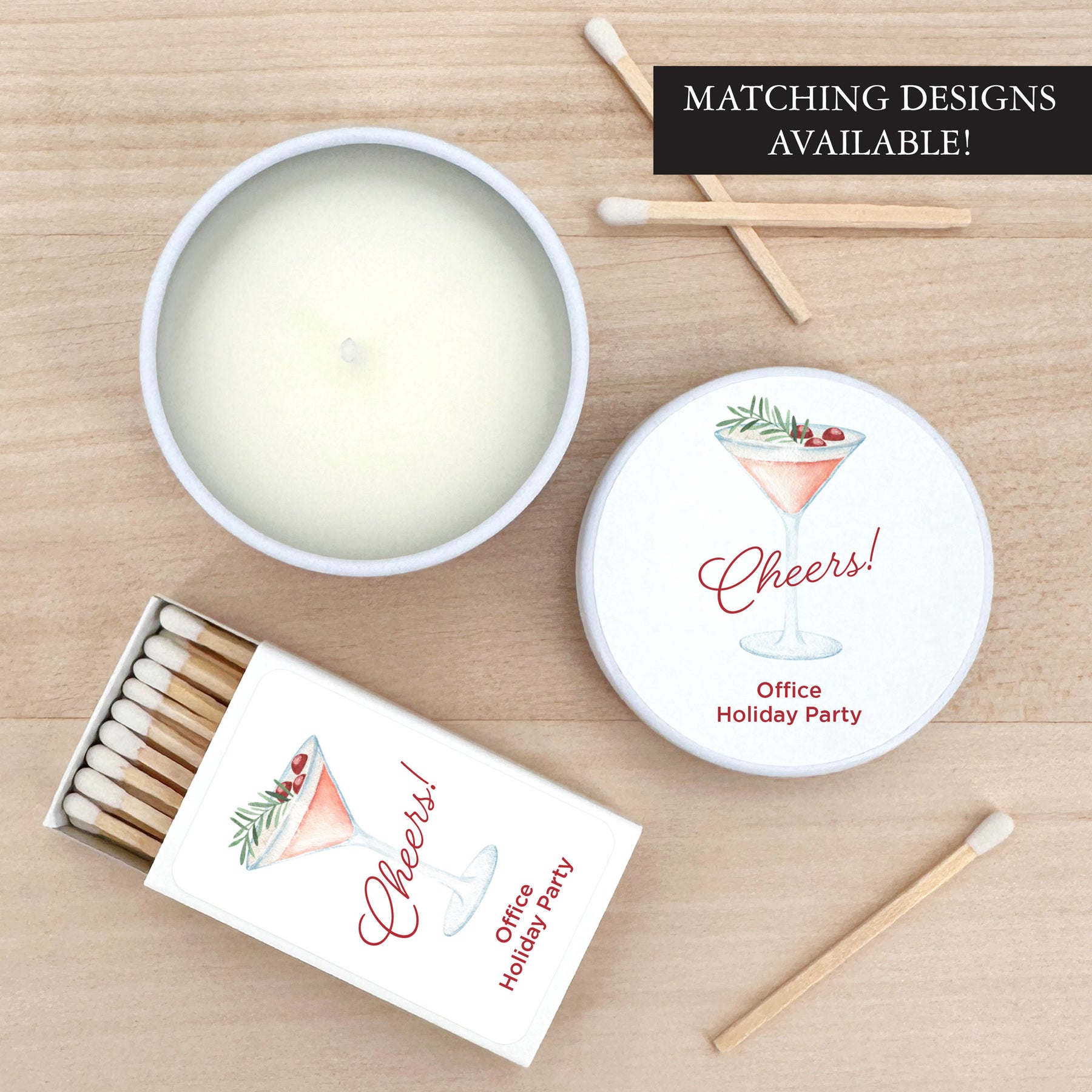 2 oz mini Christmas candles personalized for your holiday party. Offering a watercolor cocktail design that has several different headings to choose from such as: