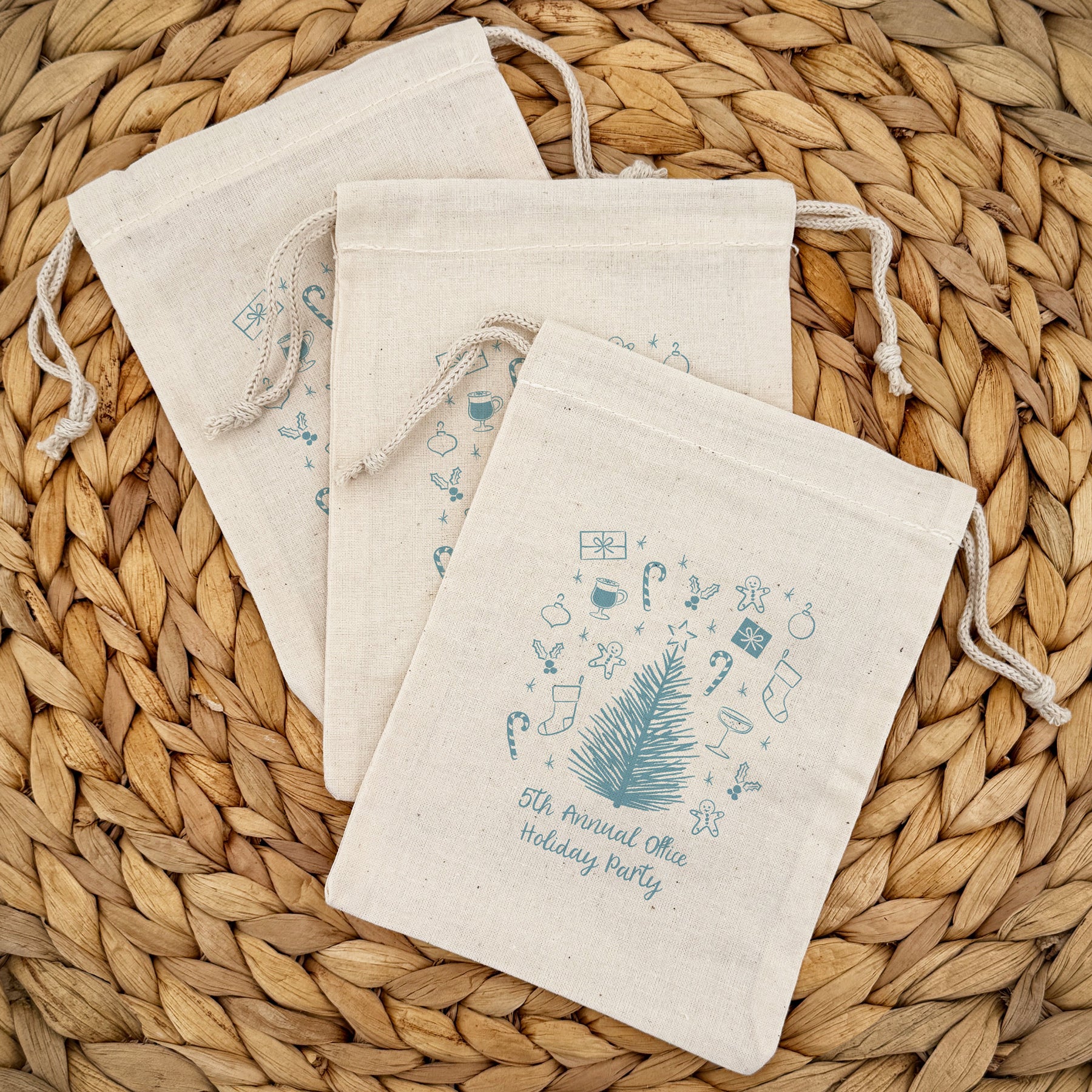 Hand drawn Christmas icons on our custom mini drawstring bags with your colors. Each bag has holiday inspired icons such as a Christmas tree, presents, candy canes, holy, gingerbread man, or spirits.