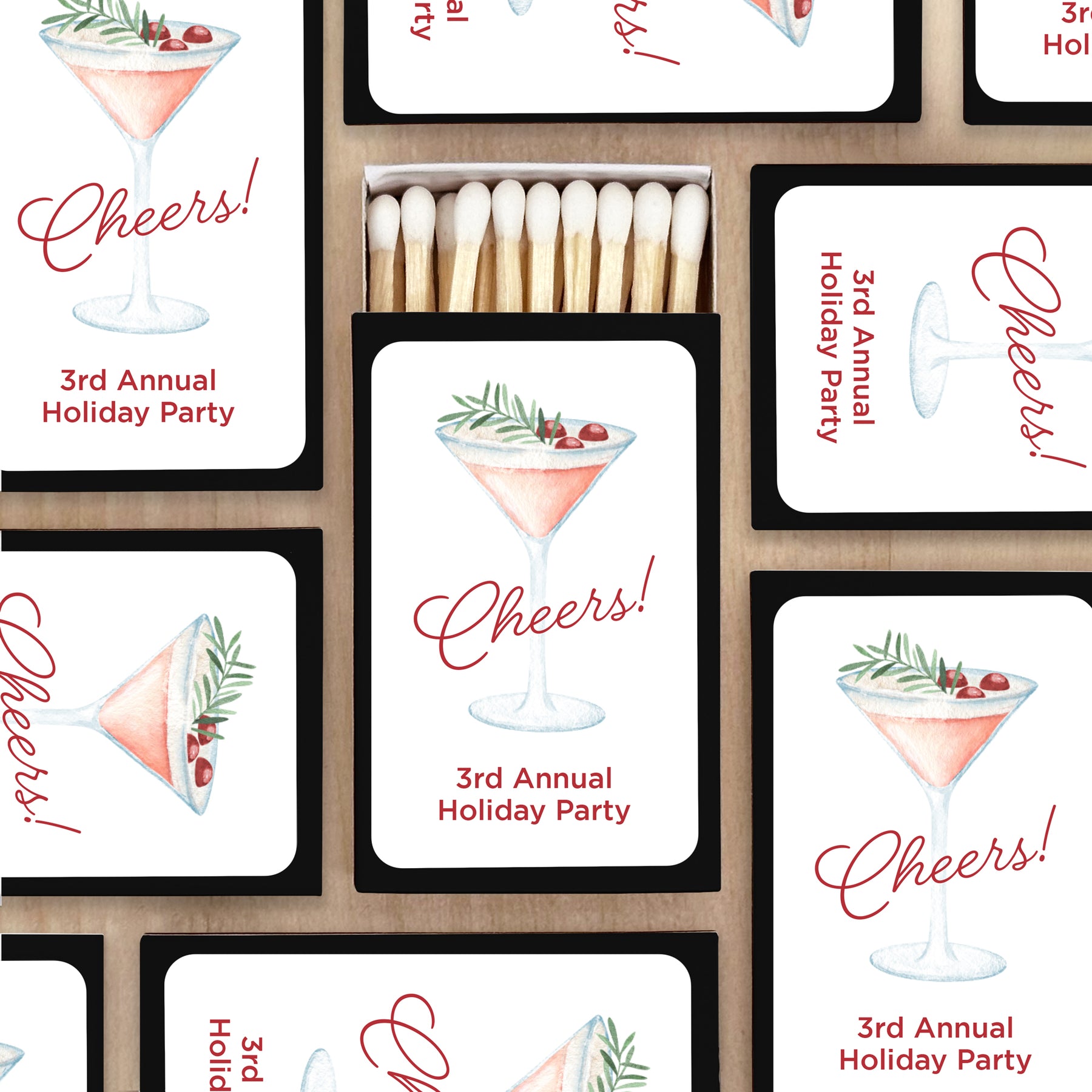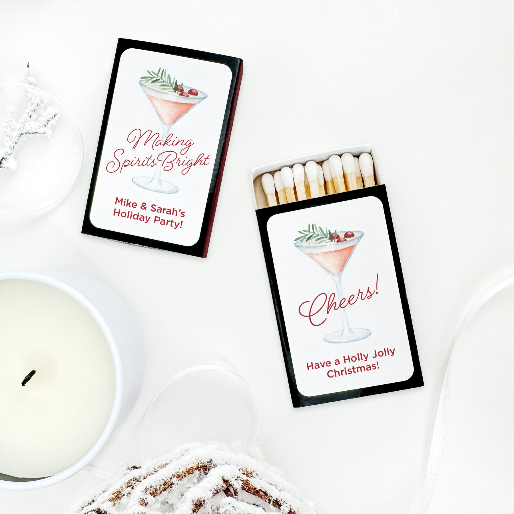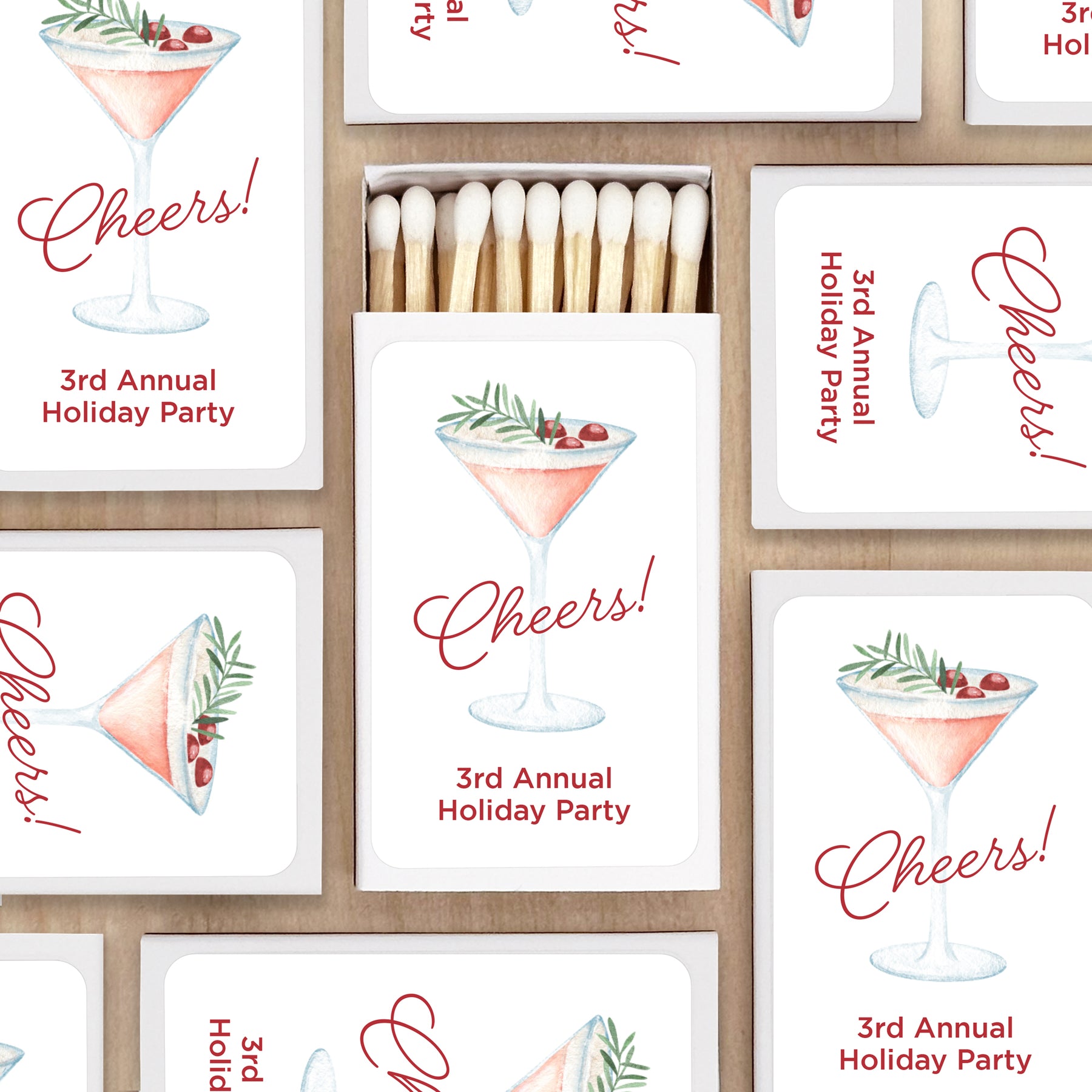 Water color holiday cocktail glass on match boxes and personalized with two lines of custom text. You have your choice in headings such as: