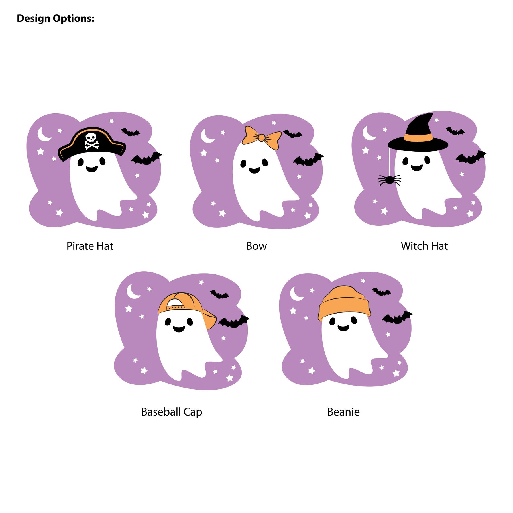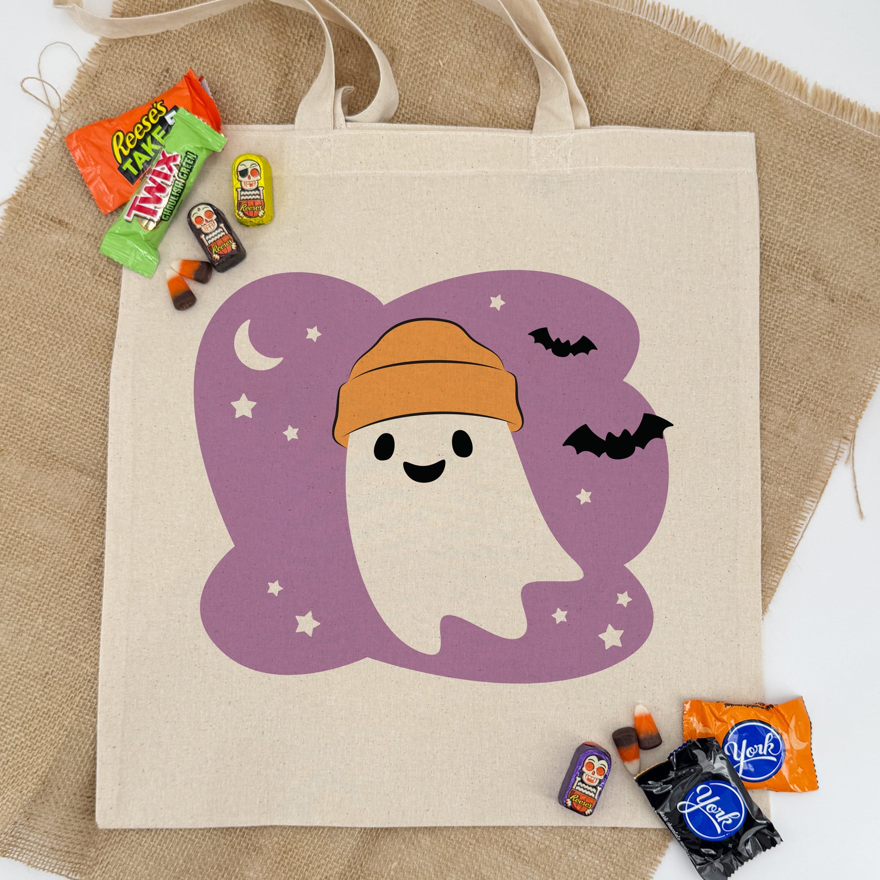 Cotton tote bag (15" x 16") used as a trick or treat bag, goodie bag, or Halloween shopping tote during spooky season. We drew an adorable ghost that has choices of accessories such as a witch hat, baseball cap, bow, beanie hat, or pirate hat.