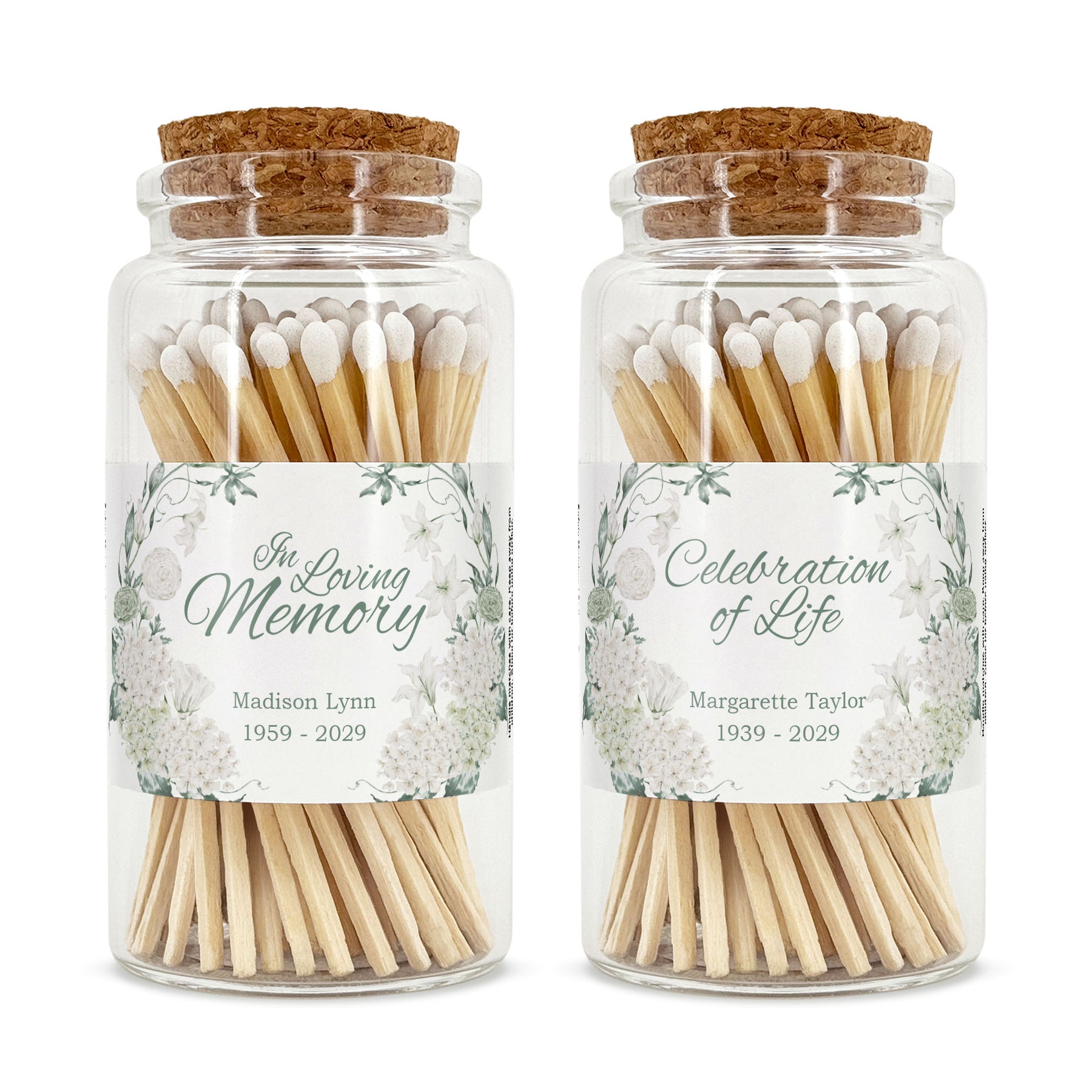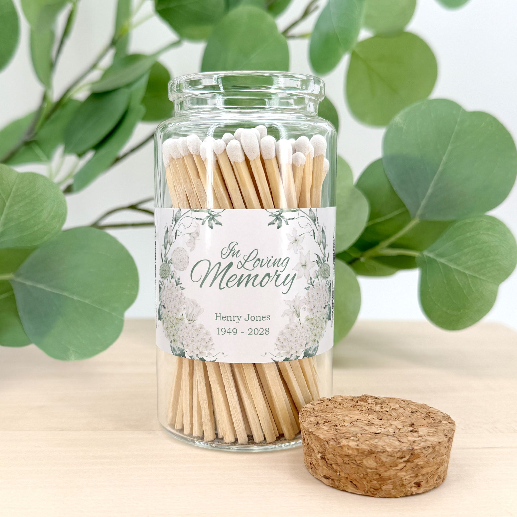 Our simple and modern apothecary glass jar with a cork lid includes 80 white tipped matches makes the perfect gift to honor and pay tribute to the memory of someone you love.