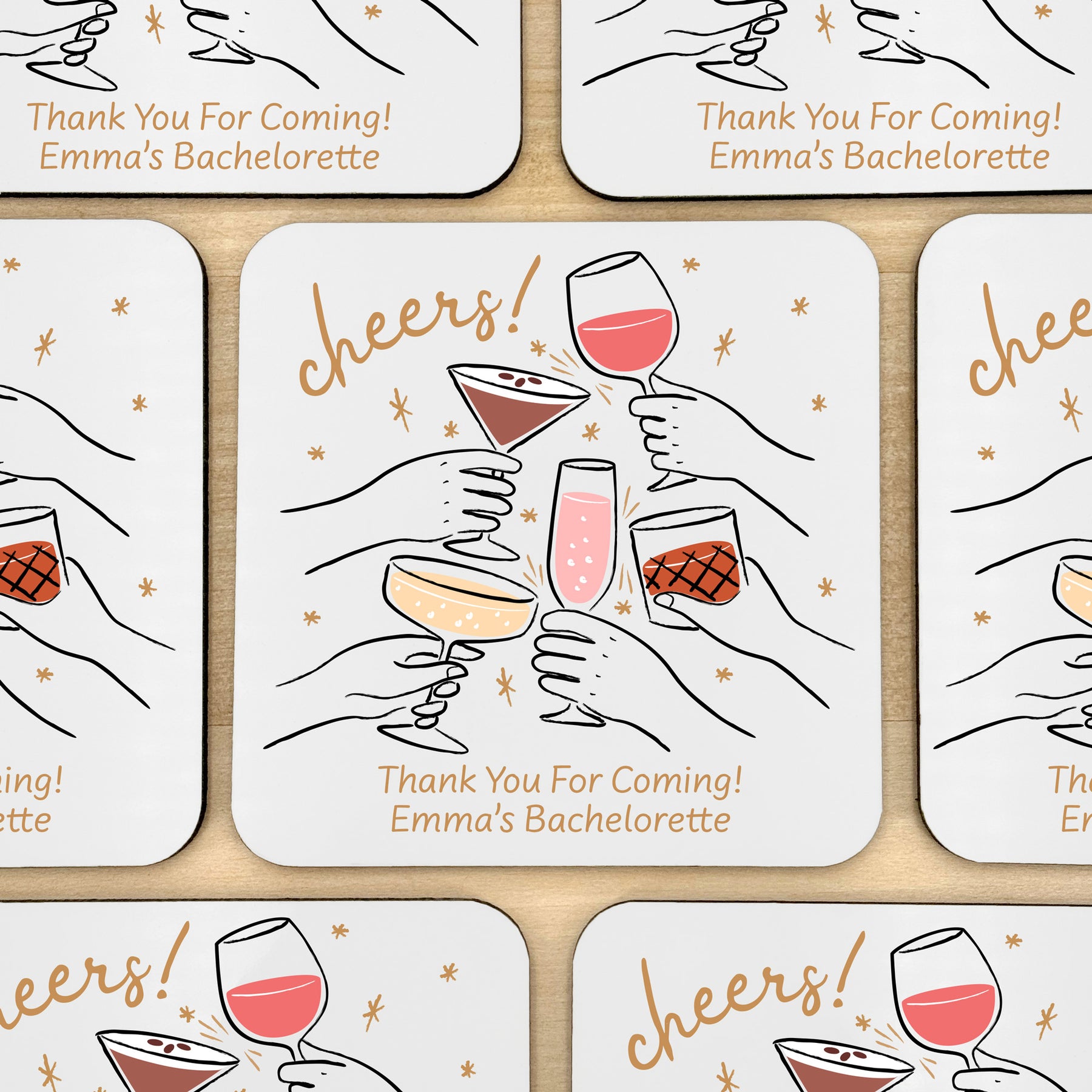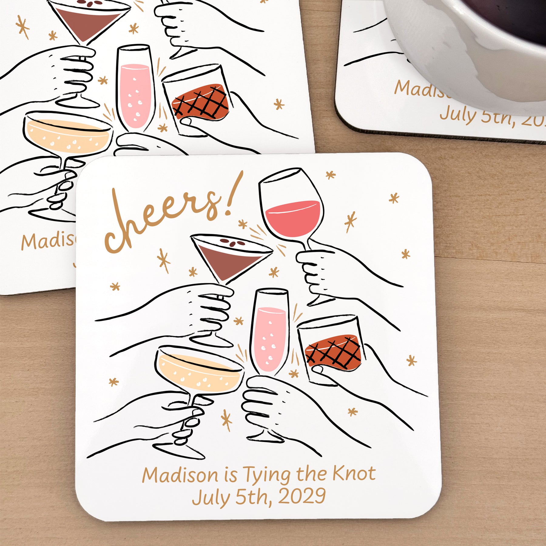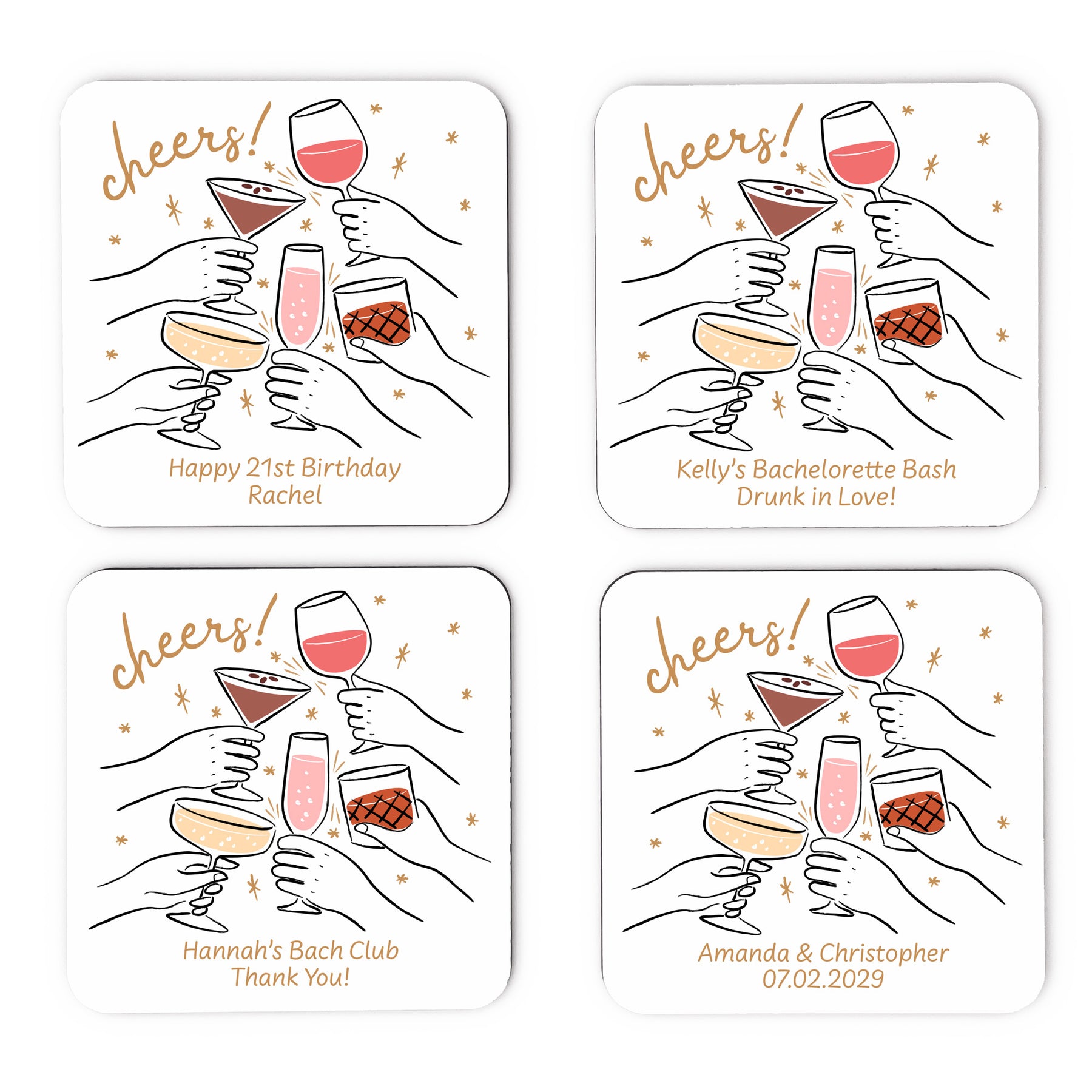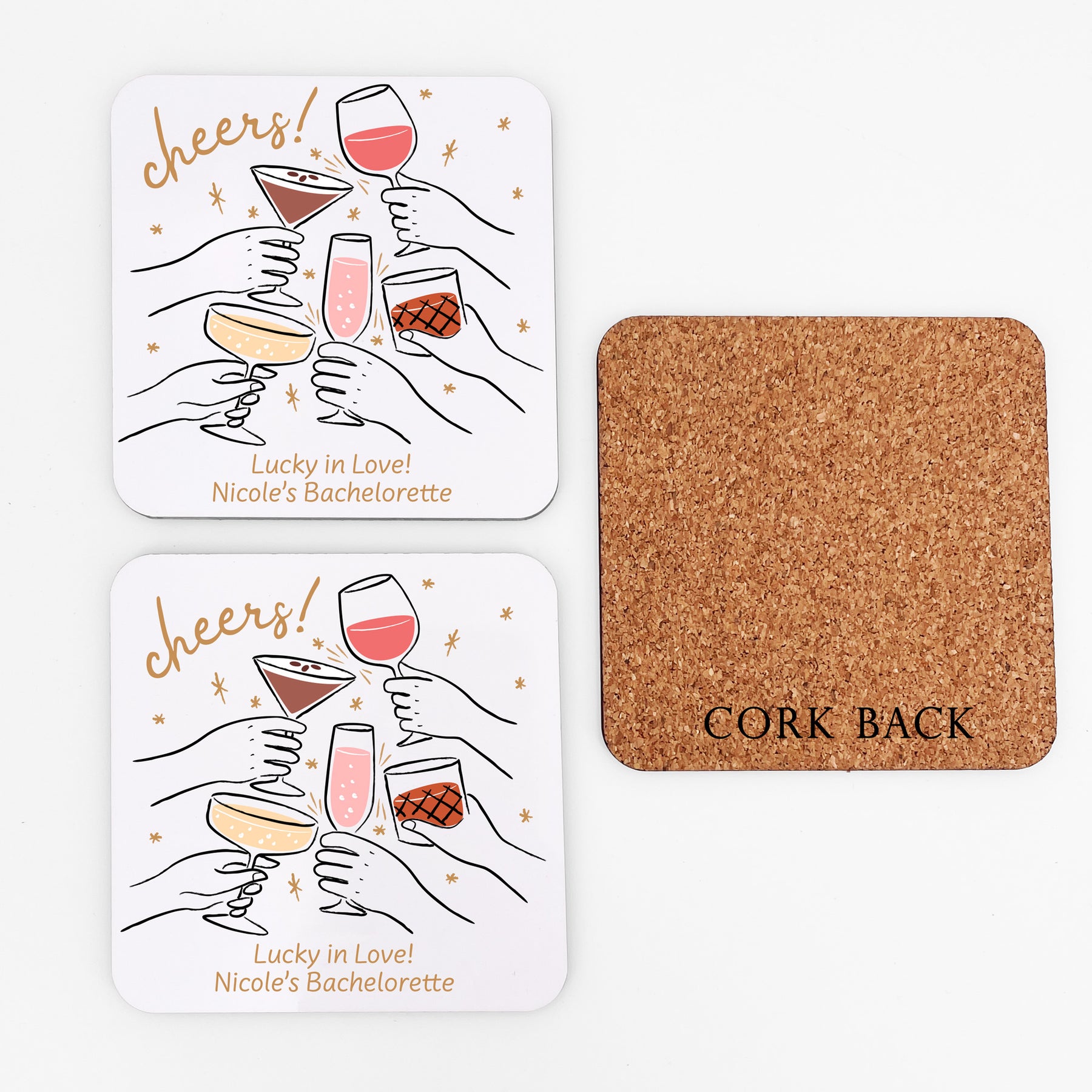 Personalized square white coasters for all of your guests! Serving wine, beer, or fun cocktails the coasters will look amazing on the table and will accent the theme of your wedding decor. We sell them in large quantity to enable you to give them to each one of your guests. Our hard plastic coaster with the cork backing is a high quality reusable coaster for all of your guests to enjoy as a beautiful keepsake from your wedding day, birthday celebration, bachelorette party, engagement party, or bridal shower.