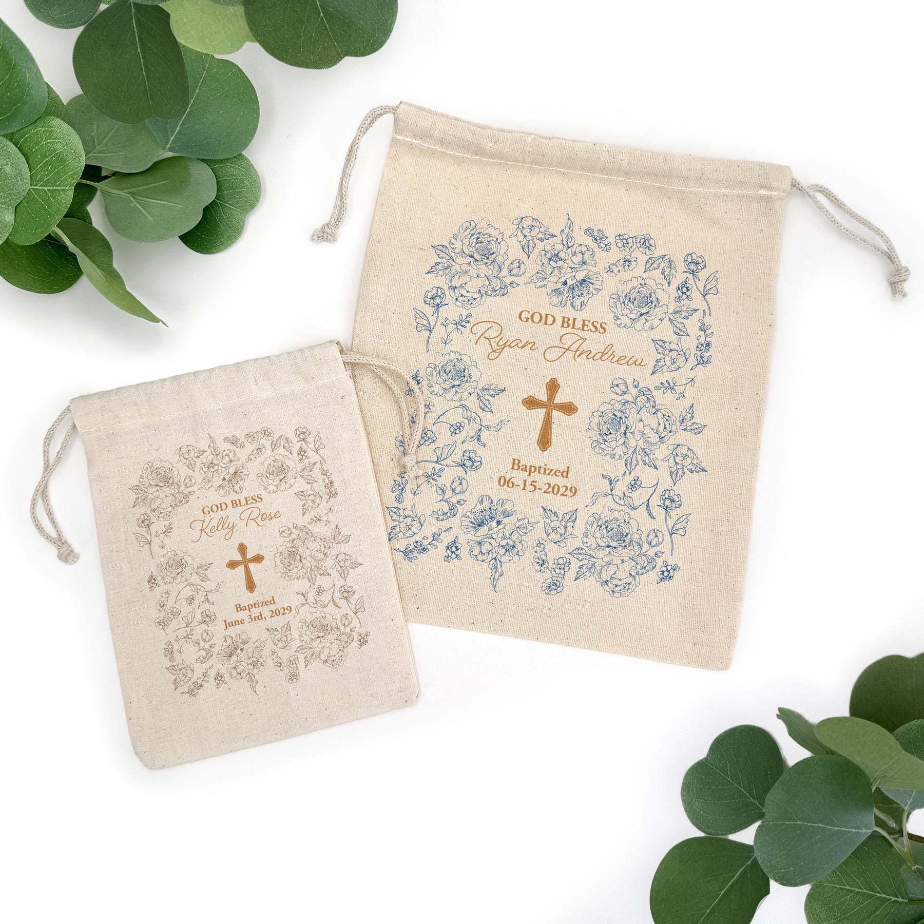Personalized cotton drawstring bags used as a Baptism, Christening or First Holy Communion gift. They are designed with a gold Cross and your choice of blue toile, pink toile, or tan toile. Each bag is personalized with two lines of custom text. Offering them in two different sizes makes them the perfect favor bag to store all of the goodies and favors for your guests.