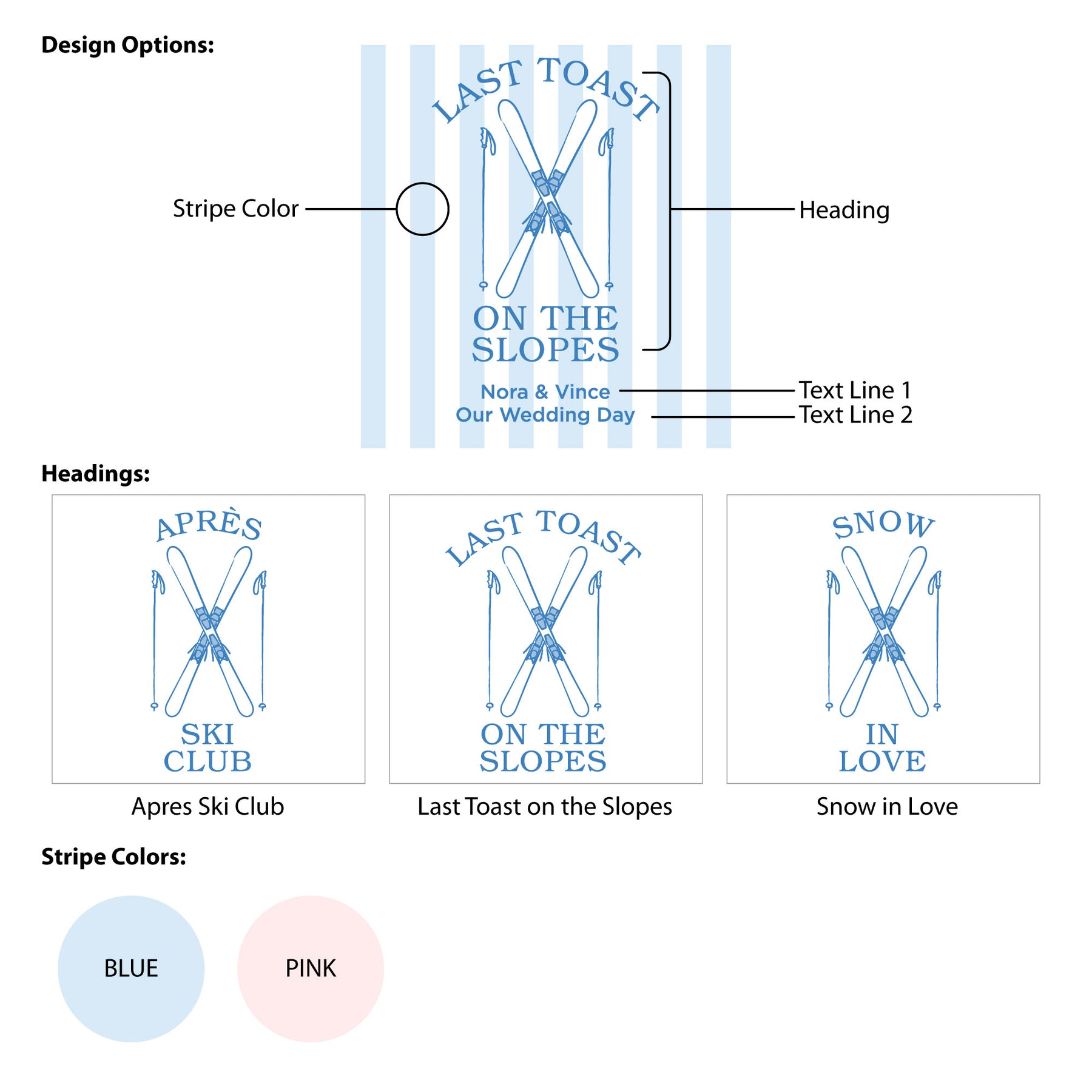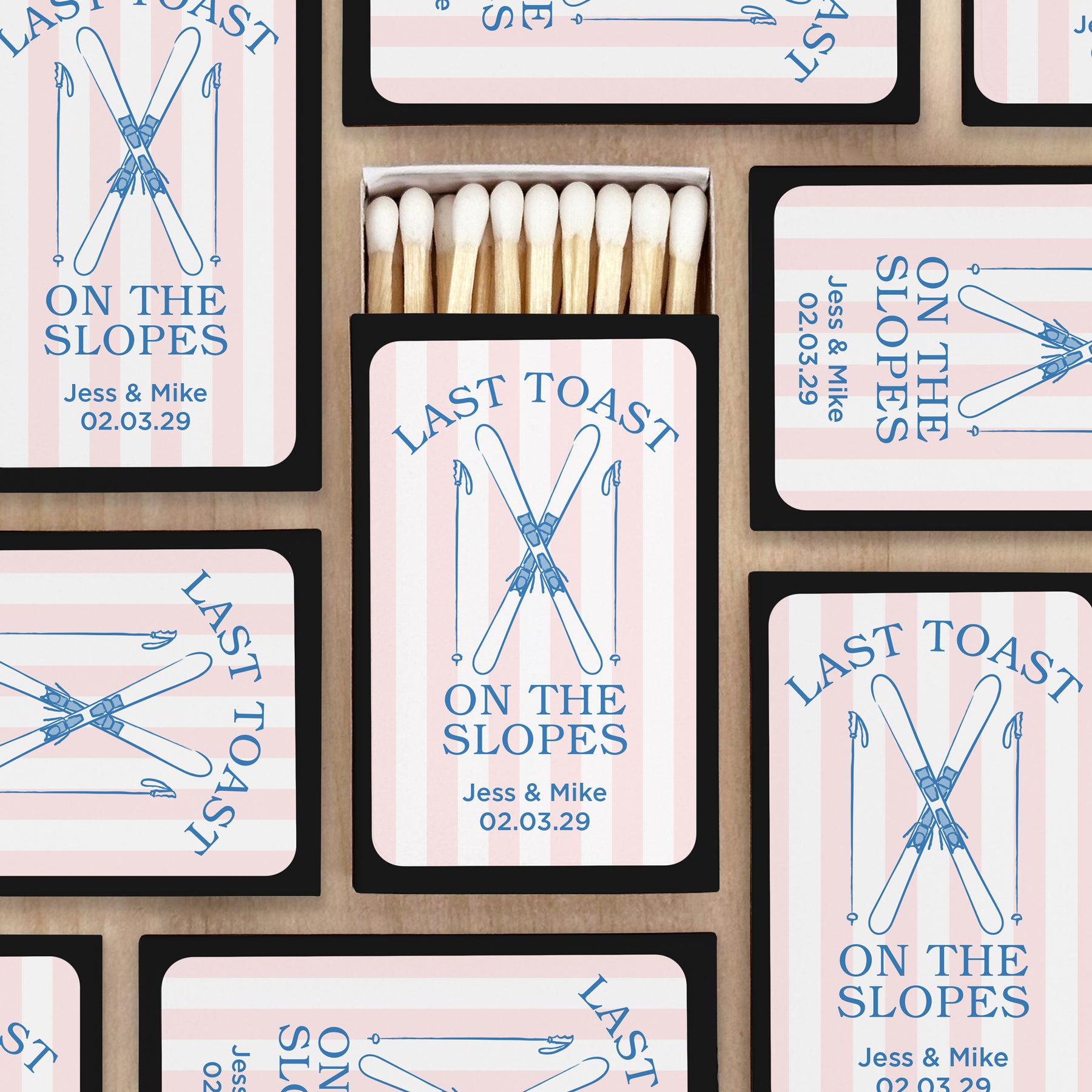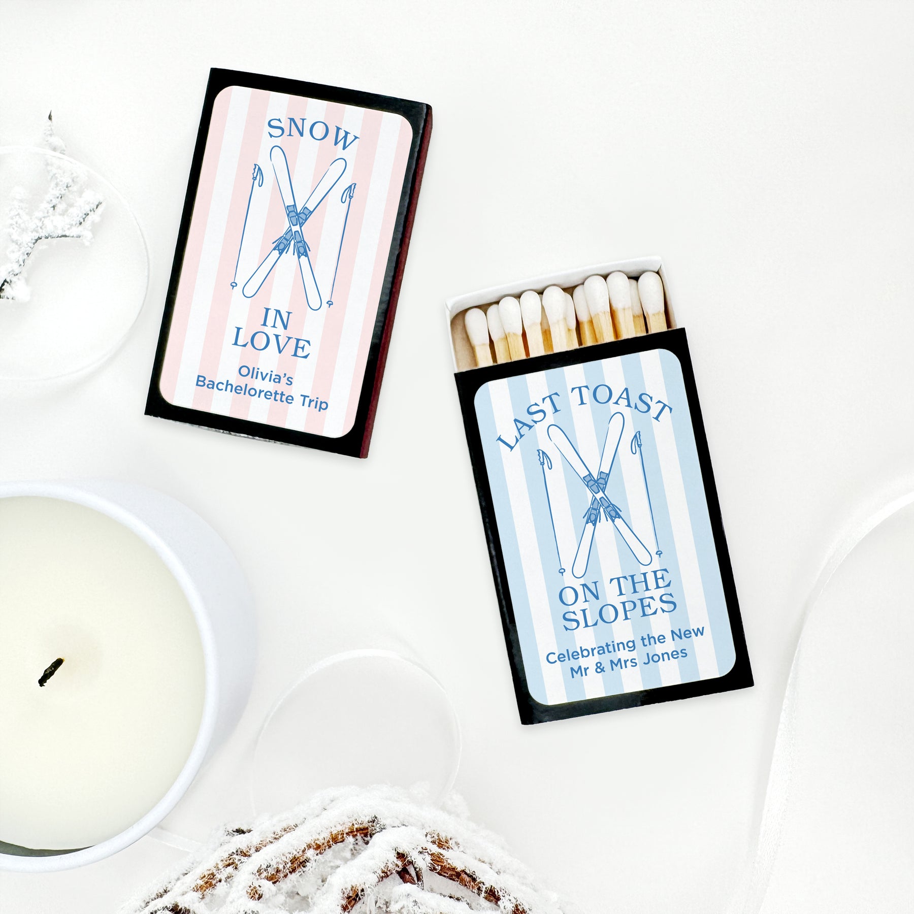 We offer beautiful matches that are perfect to accent your wedding or bachelorette ski trip! They come in a in blue or pink stripes and three different headings.