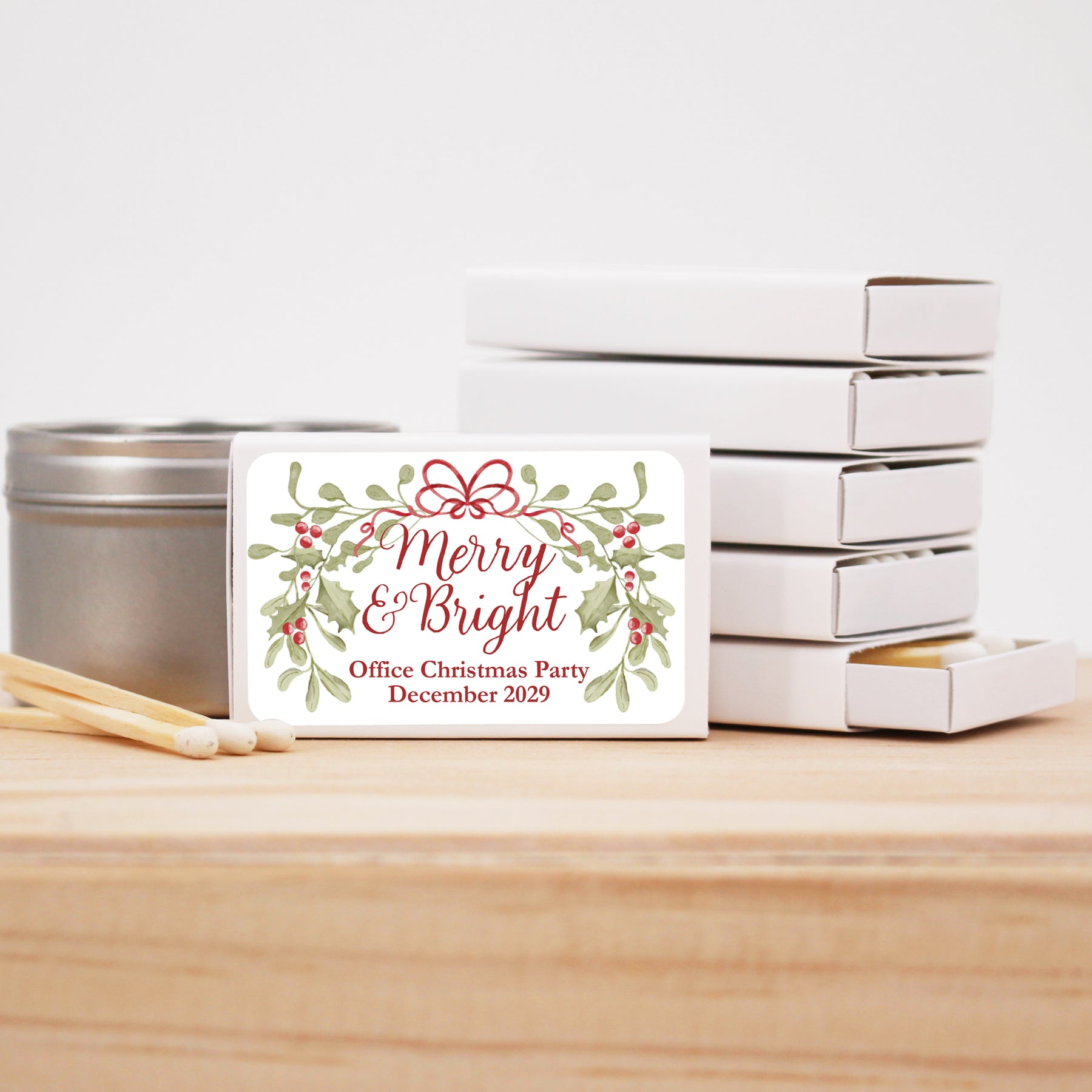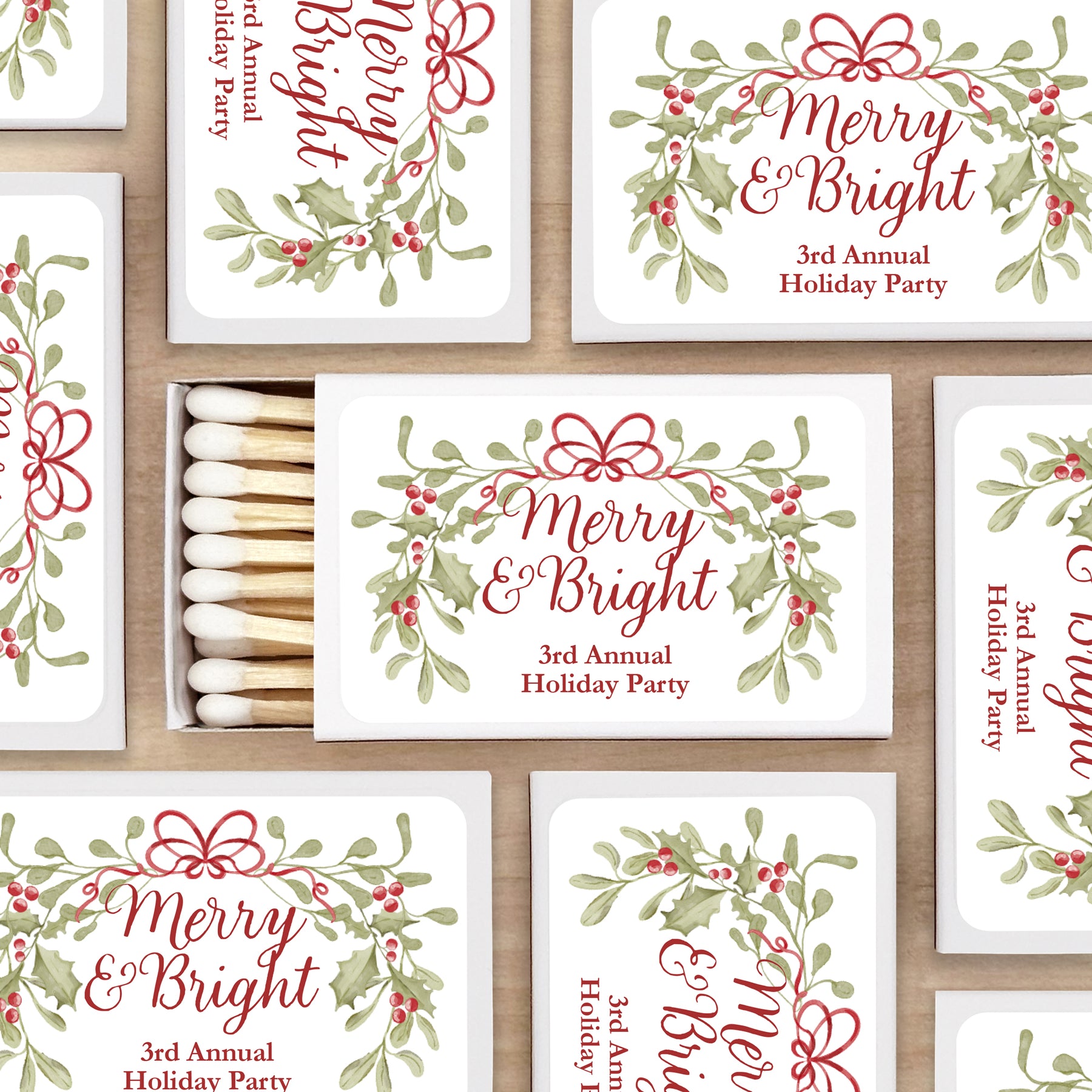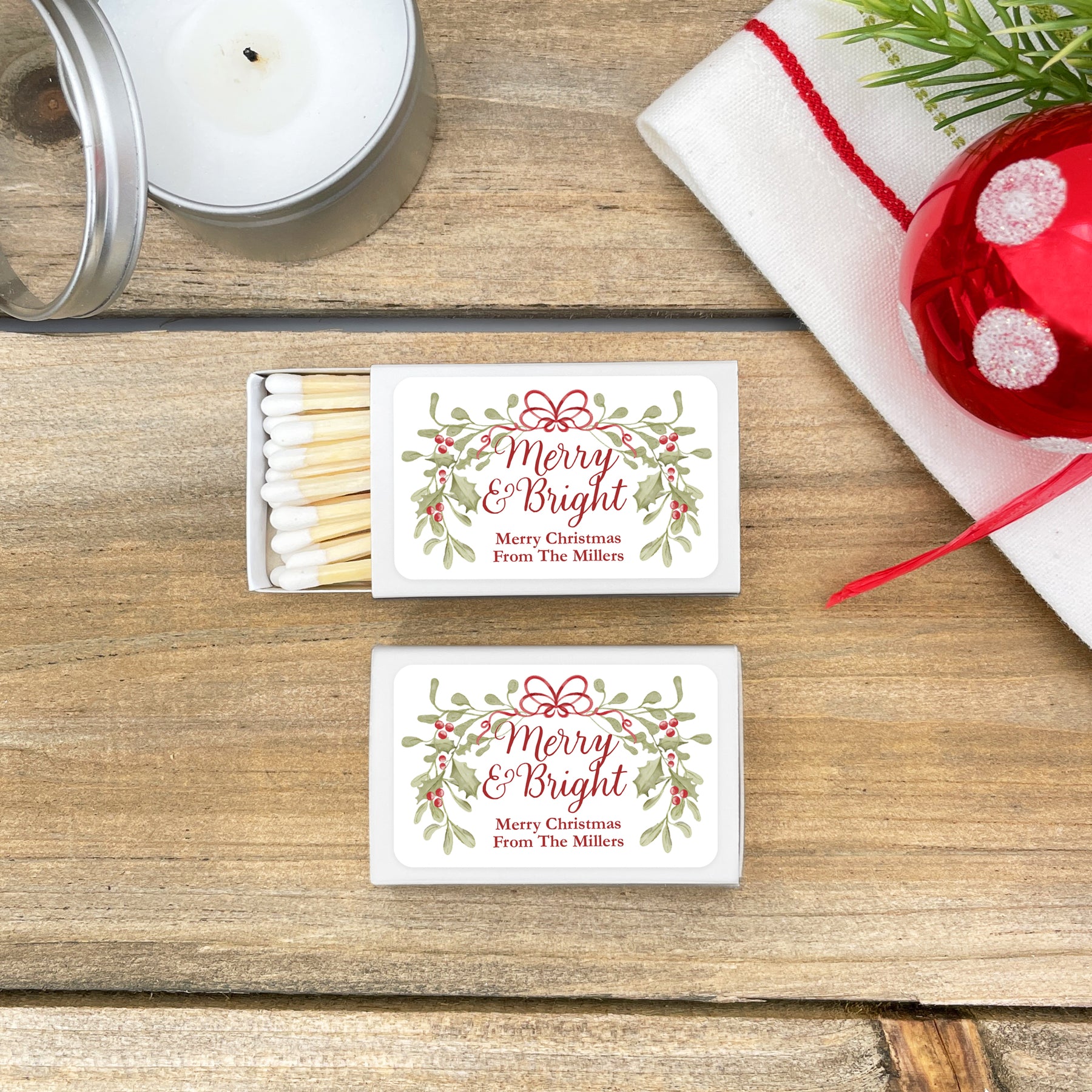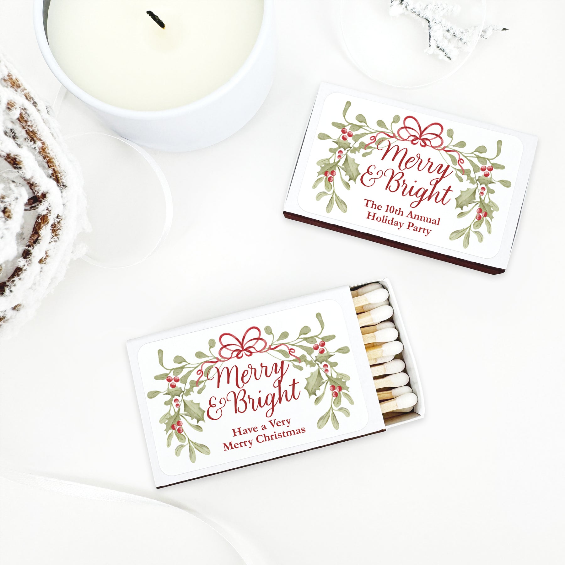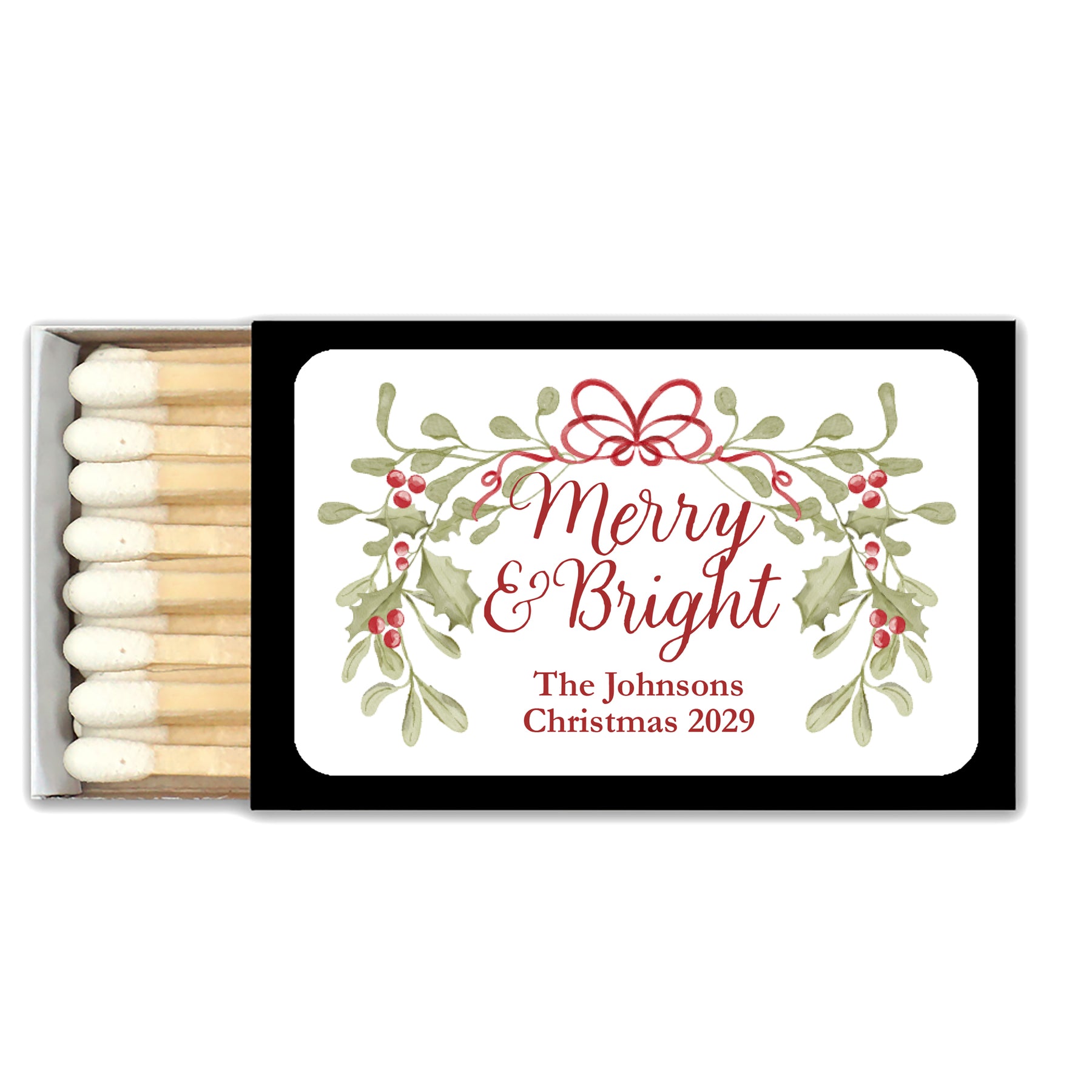 Water color green holly and red berries designed on match boxes and personalized with two lines of custom text and a Merry & Bright heading. Looking for a fun little holiday gift to give to any special person in your life? It is fun to give out matchboxes since they are so popular to collect. Mix and match these match boxes with different coordinating products. These super stylish personalized matchboxes will surely "light up" any occasion and "match" impeccably with any style. Shop the link below for more personalized holiday products.