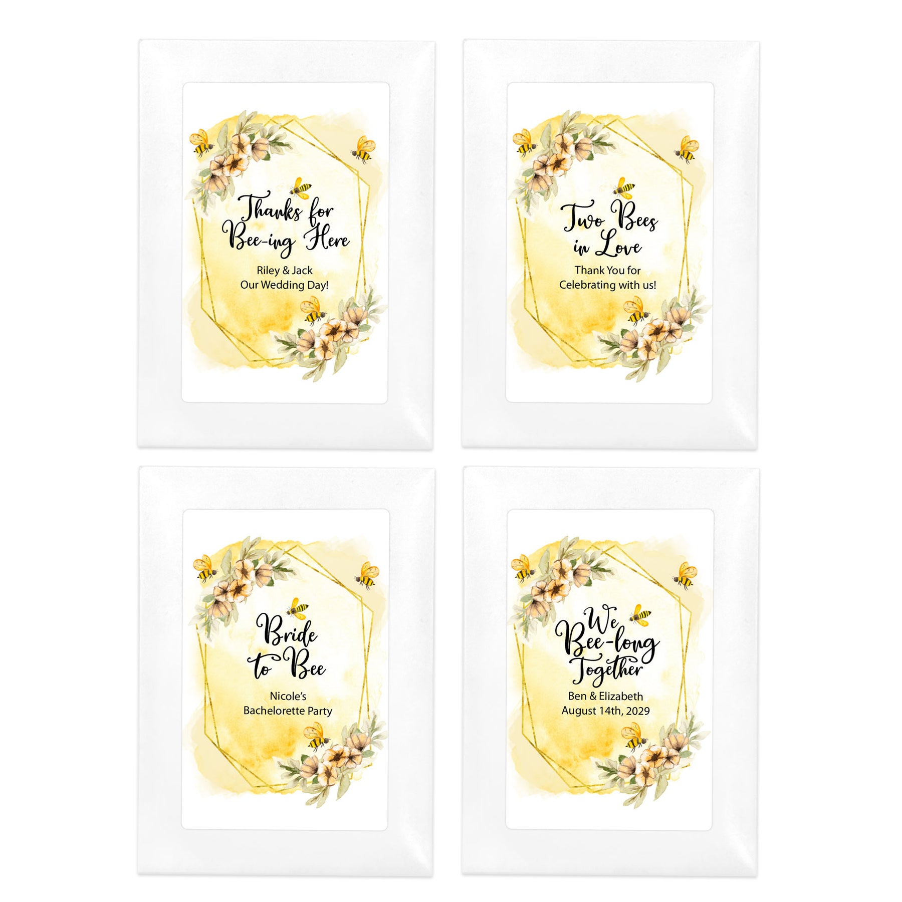 Wedding or Bridal Shower favor seed packets filled with wildflowers and designed with a floral geometric and bee vibe along with two lines of custom text. This design has many fun bee pun headings to choose from which is so perfect for our seed packets!