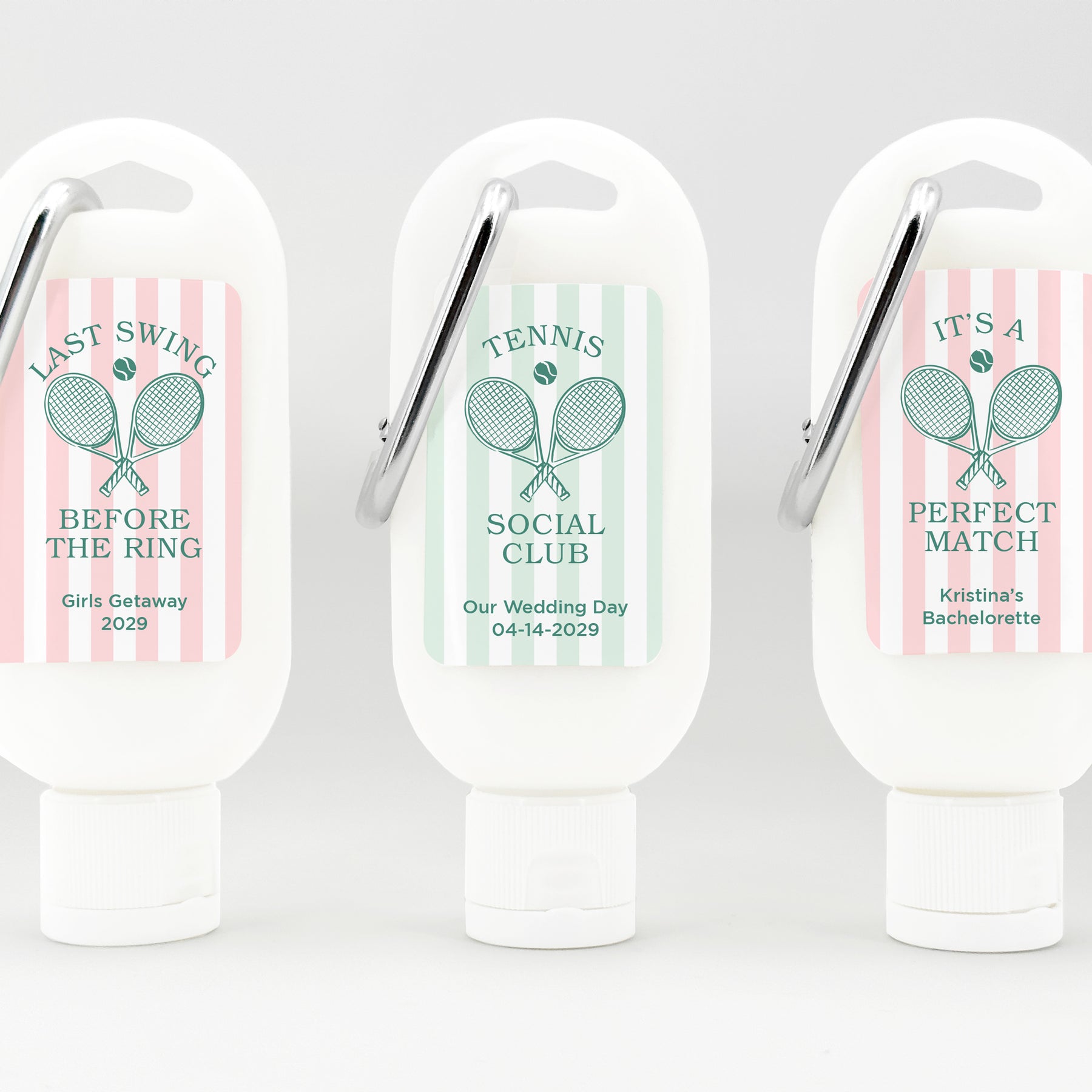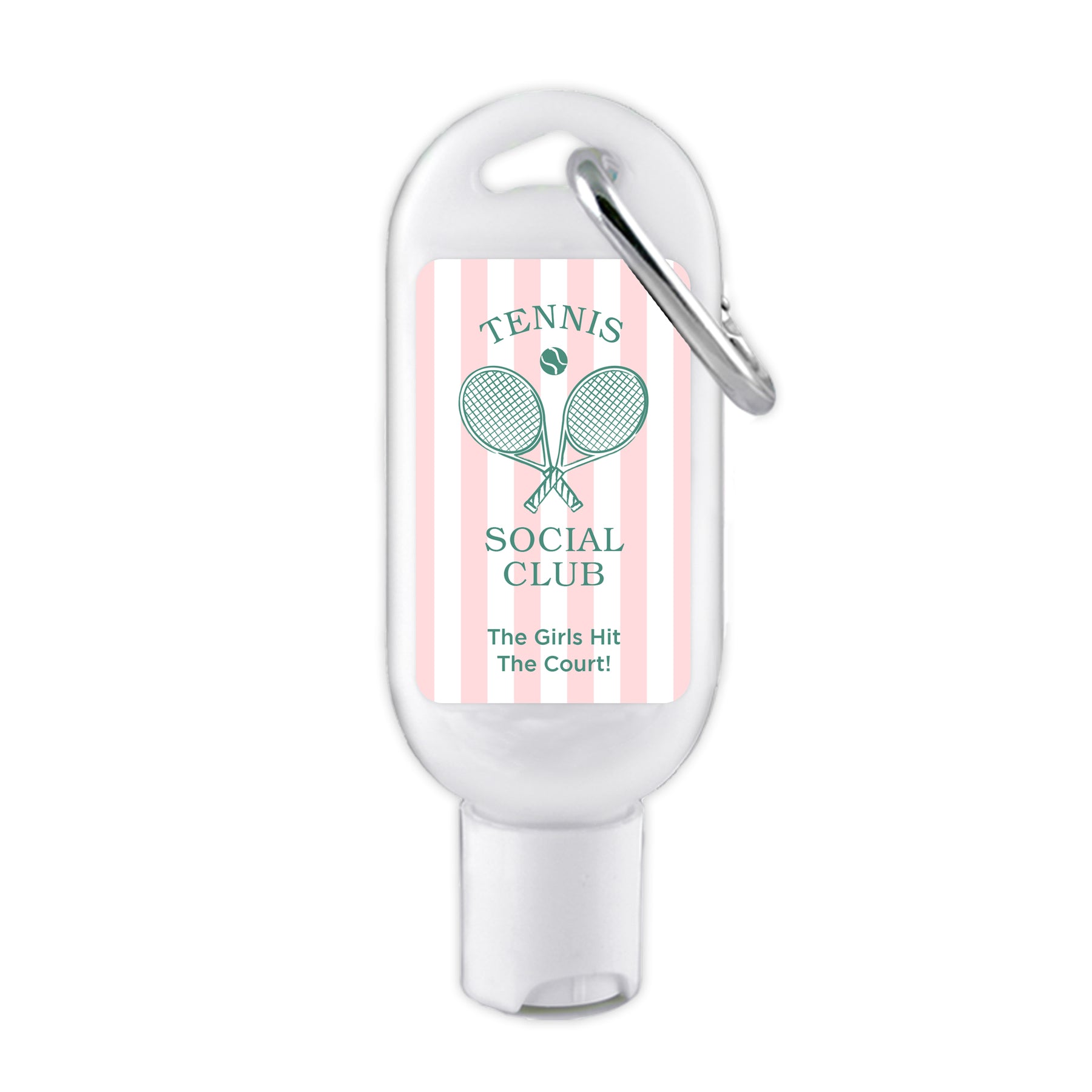 Mini sunscreen bottles with carabiner customized with a tennis design. Celebrating a girls weekend, bachelorette weekend, or a bridal shower, our mini travel size sunscreen bottles are personalized and will make a perfect gift for your guests.