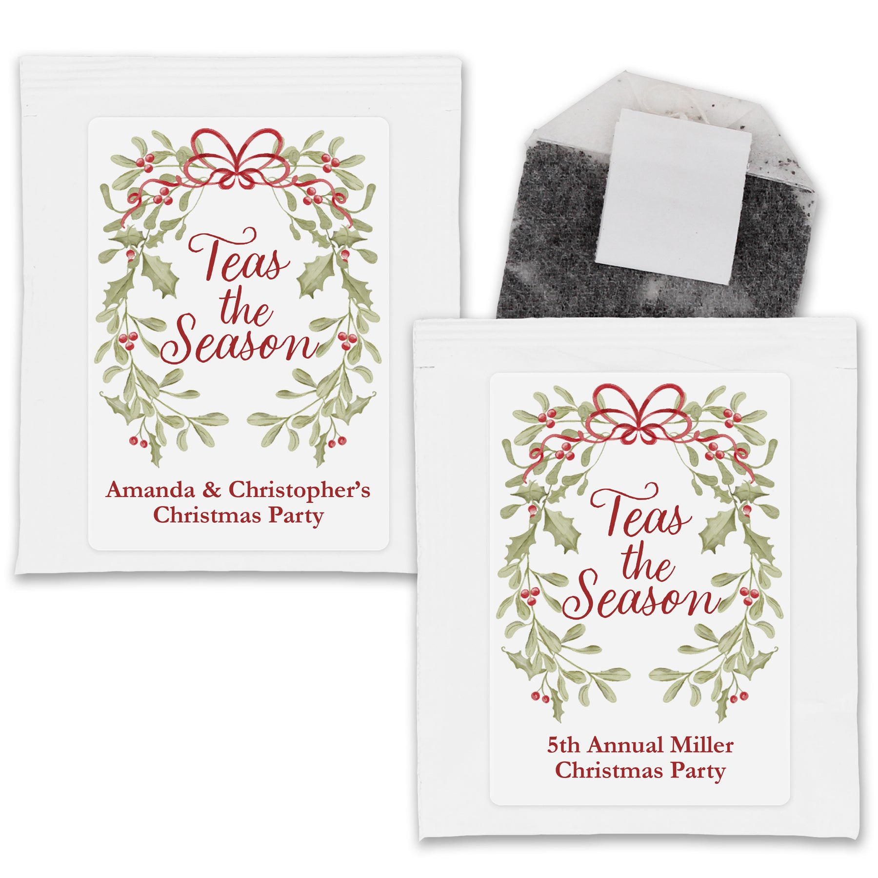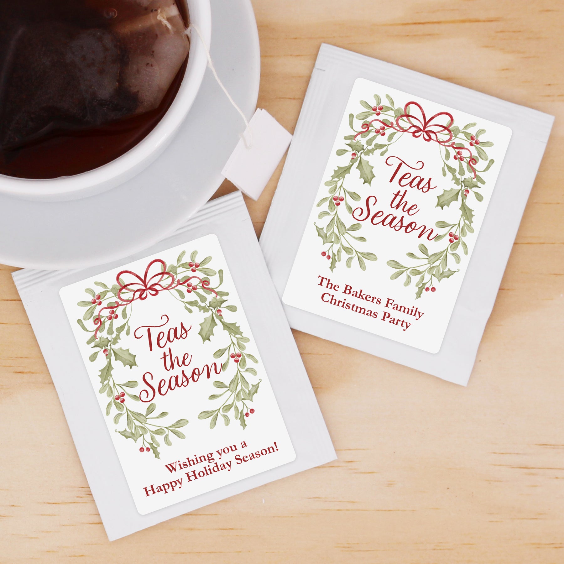 Tea bags in a white packet labeled with "Teas the Season" with greenery and holly. Each tea pack is personalized with two lines of custom text. Having a tea party over the Christmas holidays? Inviting your family and friends over during the holiday season creates a lot of nice memories and our tea will make your Christmas or Holiday party fun and festive. Give your guests and family members a moment of relaxation with a soothing cup of delicious tea to celebrate wonderful moments in life.