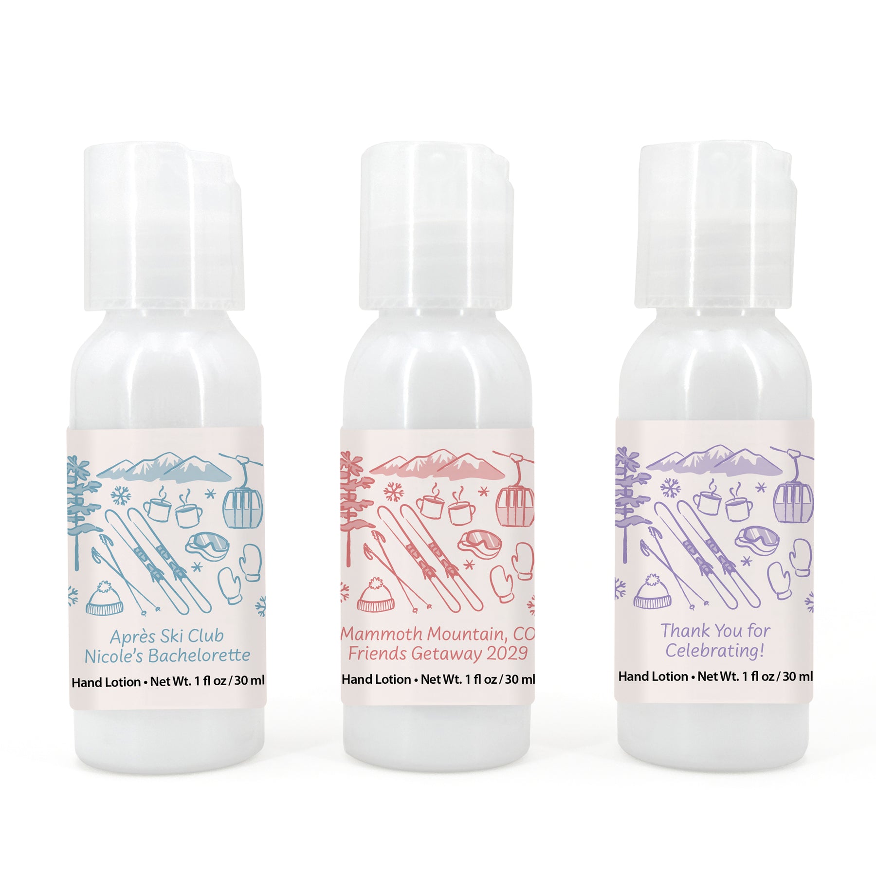 Mini hand lotion with a doodle sketch design customized with ski inspired icons and two lines of custom text. Perfect favor for your bachelorette party, birthday party, or girls trip. Check out the rest of this collection. We offer our whimsical doodle sketch design collection on many different products so you can mix and match what is best for your celebration.