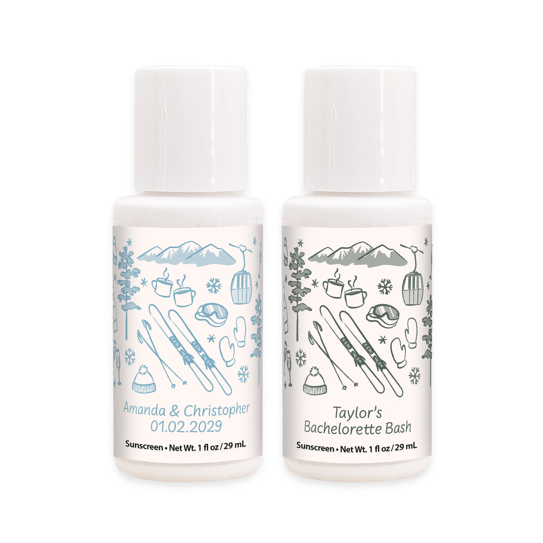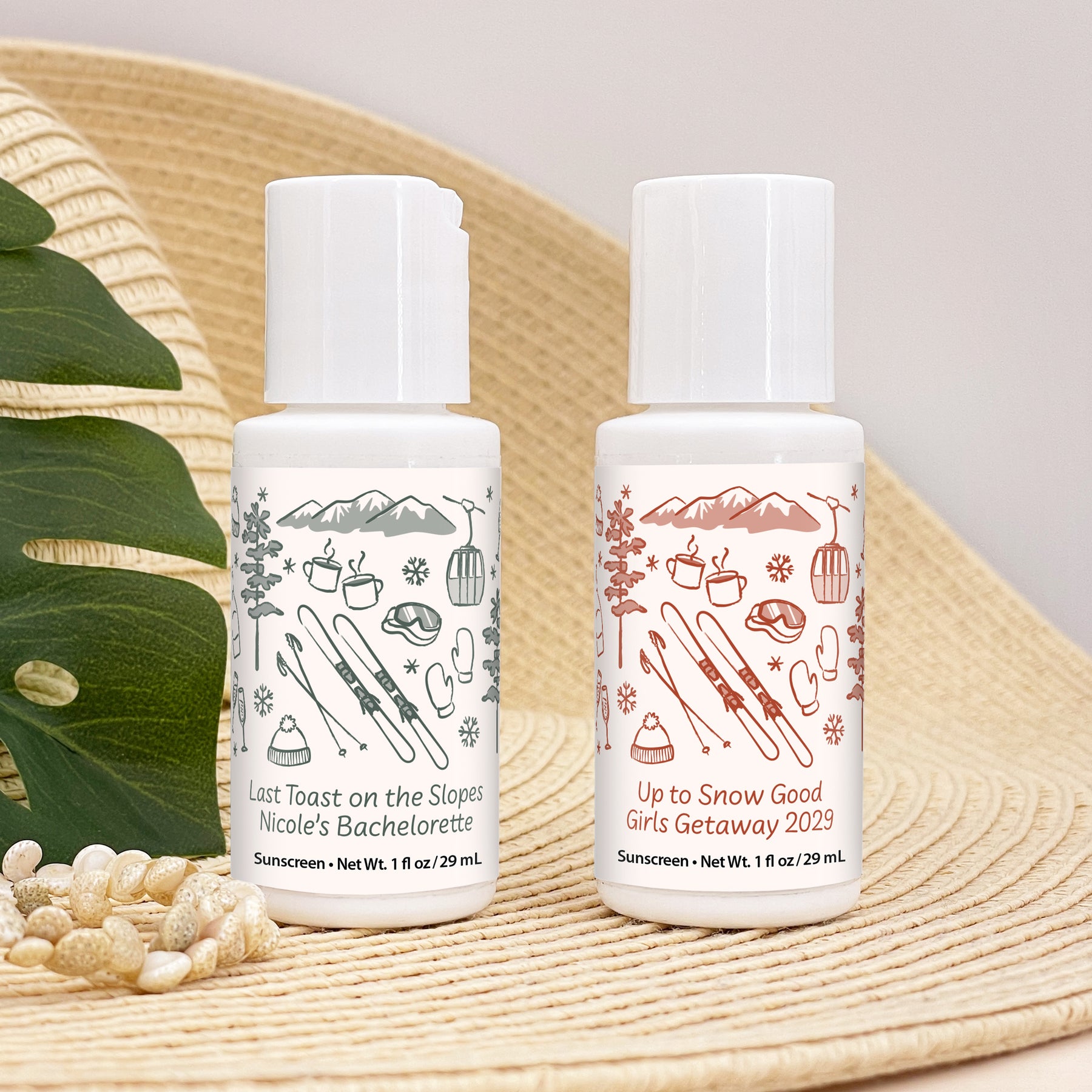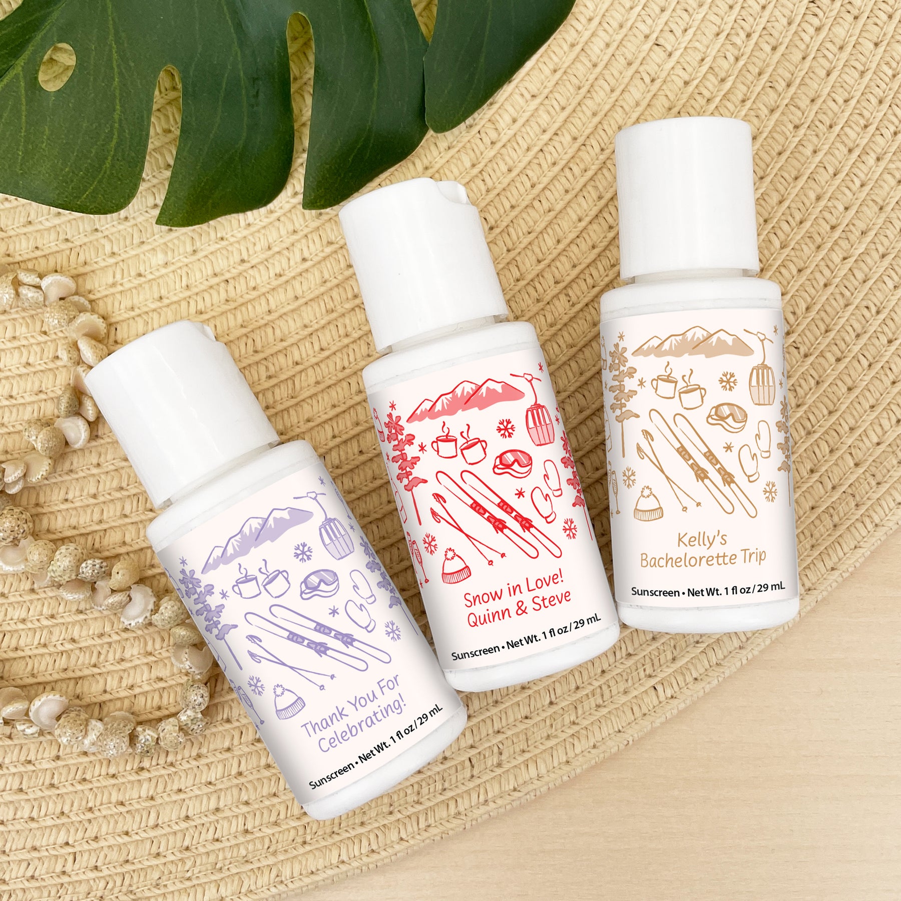 Ski inspired bottles of sunscreen personalized as a favor or gift for your bachelorette party, wedding reception, birthday party, or girls’ weekend.