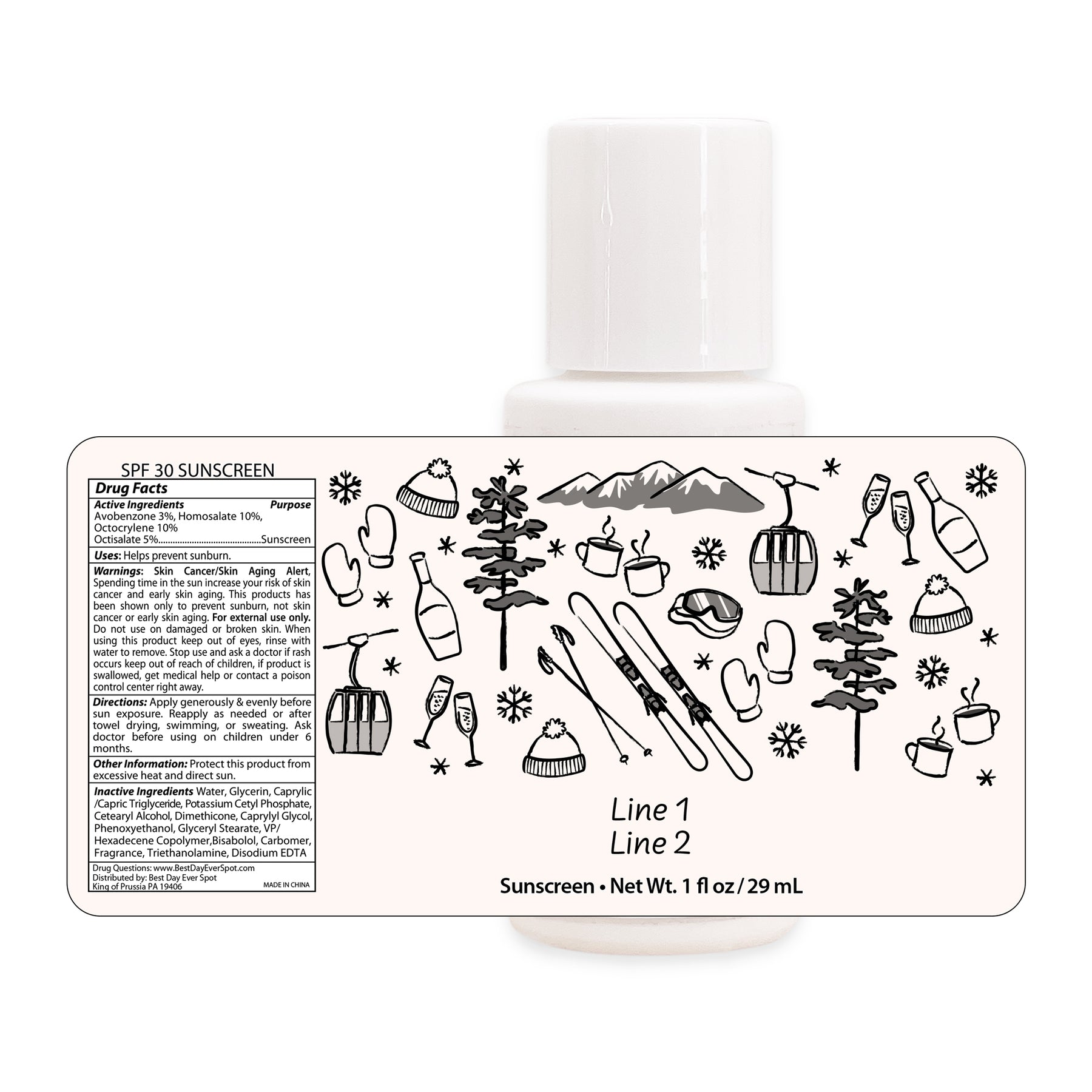 Our hand drawn ski inspired icons on our mini sunscreen favors making them the perfect necessity for your bachelorette trip. Your guests will enjoy the sunscreen favors on their trip. In addition, the sunscreen will make a nice gift to remember the fun times they had at the bachelorette party or birthday party. Since our sunscreen is personalized, it gives you the opportunity to be fun and creative with the two lines of custom text.