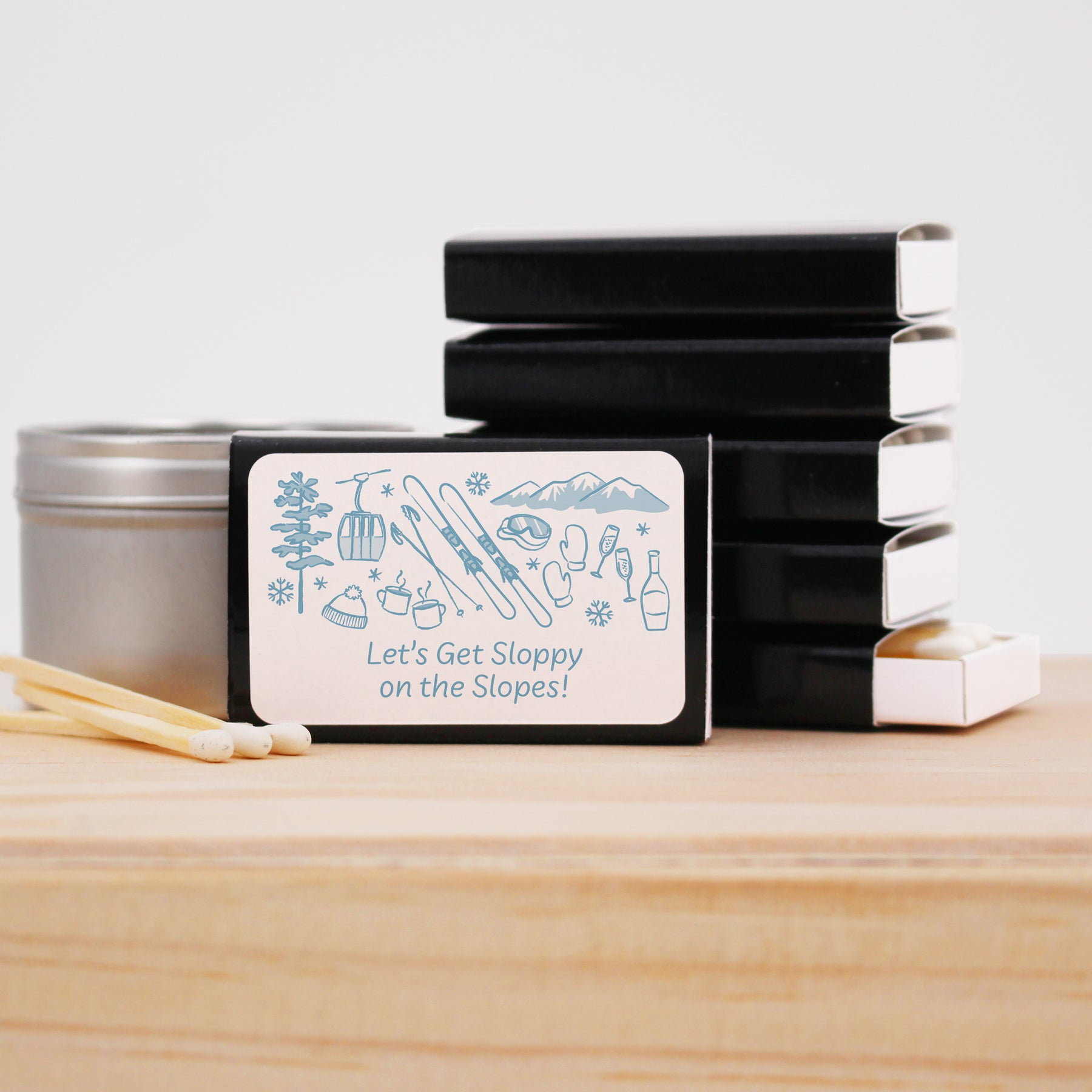 We drew up some fun ski inspired icons on our match boxes for your bachelorette party or wedding reception. Our match boxes with their hand drawn little sketches represent the meaningful details of a fun ski getaway and can be used at your girls' trip, bachelorette party or wedding reception as favors or gifts for your guests.