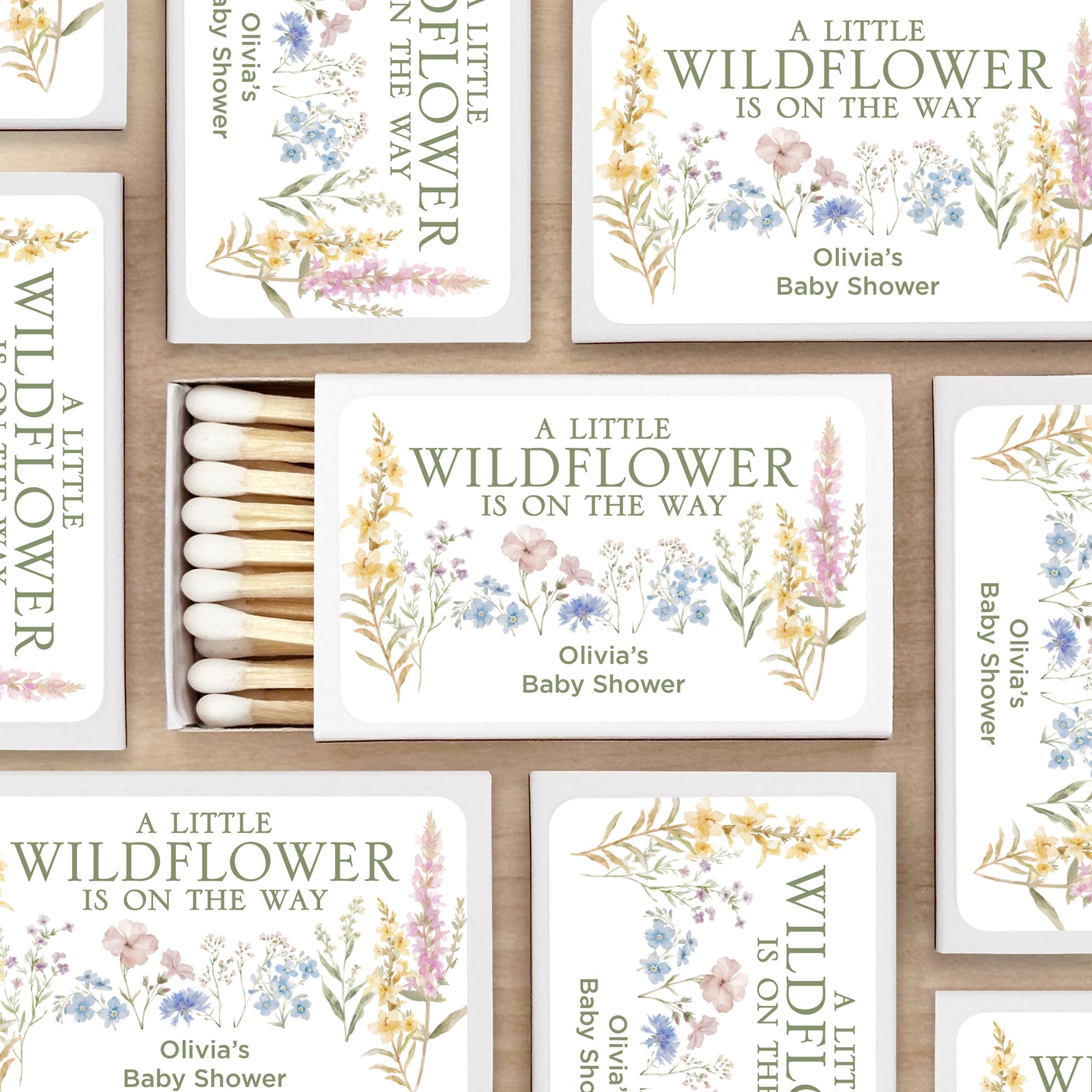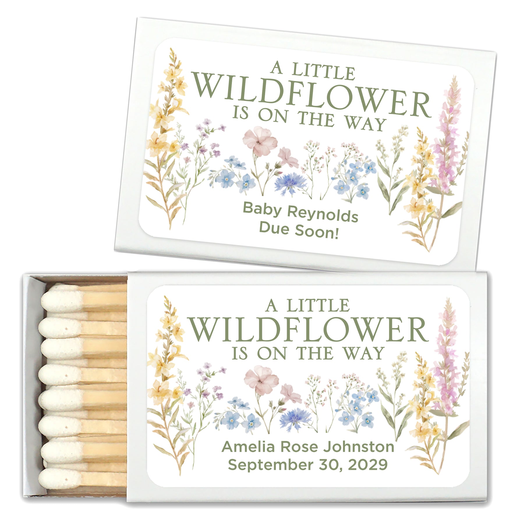 Watercolor wildflower design with a heading that says "A little Wildflower is on the Way" customized on our match boxes making them the perfect baby shower favor for your guests. We also offer this design in many different products. Check out this design on honey jars, candles, and lip balm - just to name a few.