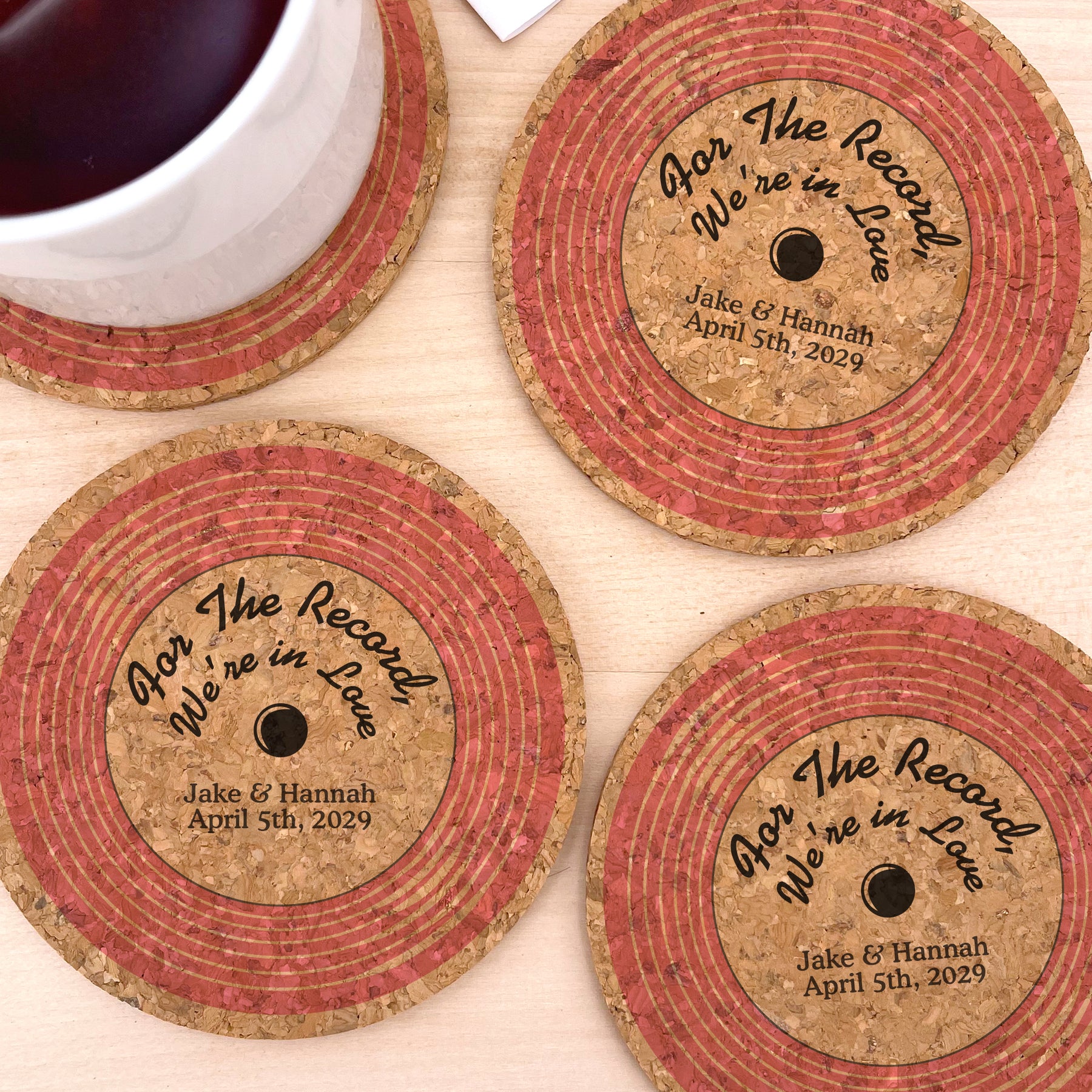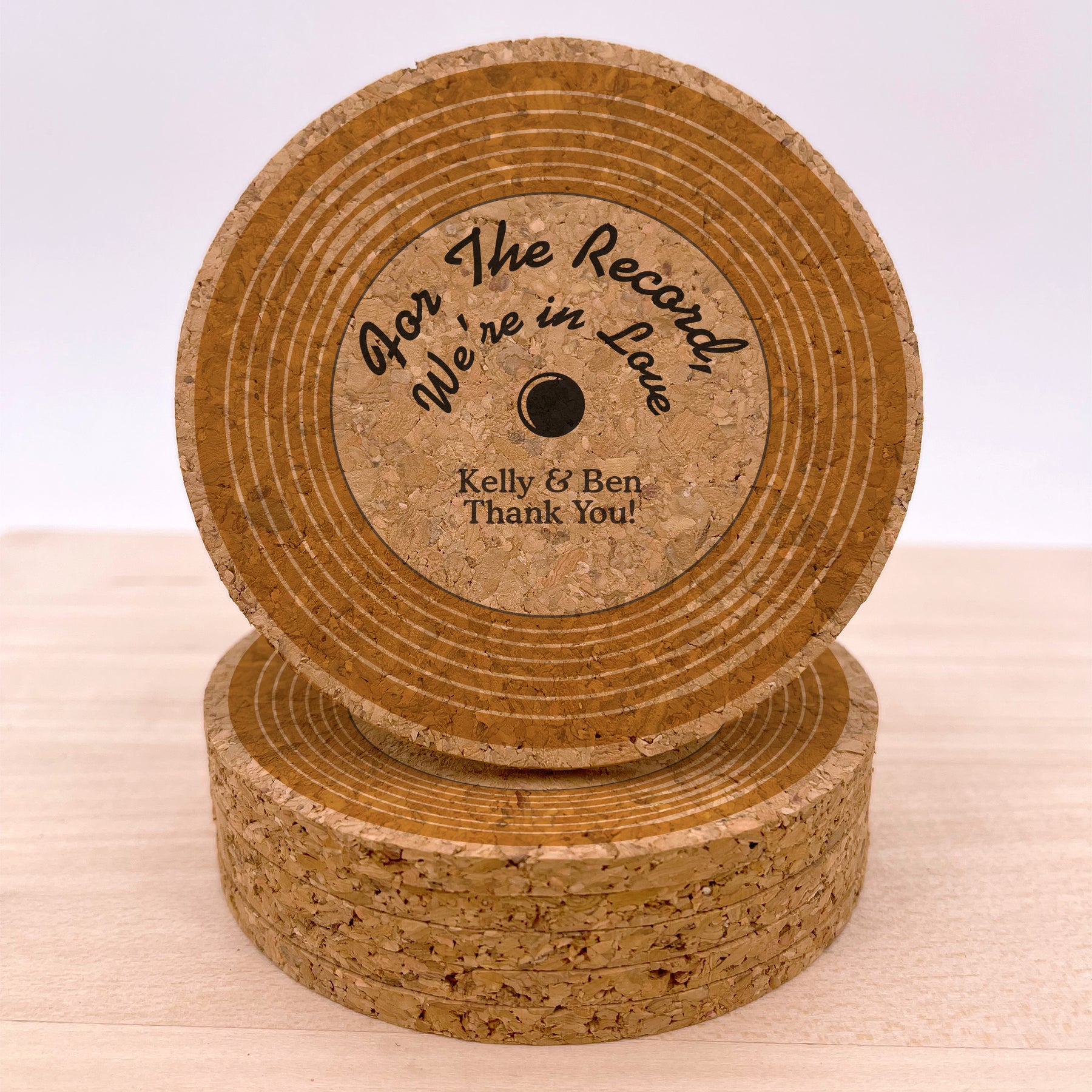 For the record, our Personalized Vinyl Record Cork Coasters add a unique and decorative touch to any event! Choose from a selection of color options to perfectly coordinate with your special day!